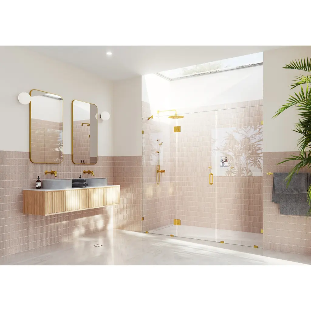 The Stellar is a beautiful, three-panel, glass-hinged shower enclosure that adds openness and an element of elegance and luxury to your bathroom. Taller than most competitor shower enclosures, each frameless 3/8" tempered glass panel comes in a standard 78" height. At the same time, the door is positioned in the center to allow easy access and space for wall accessories or a design that doesn't suit a wall-hung door. Glass is treated on both sides with EnduroShield coating, which aids in repelling water and soap residue, allowing the panels to be fully reversible. In addition, the superior quality solid brass hardware is available in a variety of color finishes to suit any bathroom. With extensive range of frameless shower doors and panel sizes, the Stellar by Glass Warehouse is the perfect model to suit a dual shower or to span a wider shower enclosure.Glass Warehouse GHF-85.5 Features:Glass Warehouse GHF-85.5 Specifications: