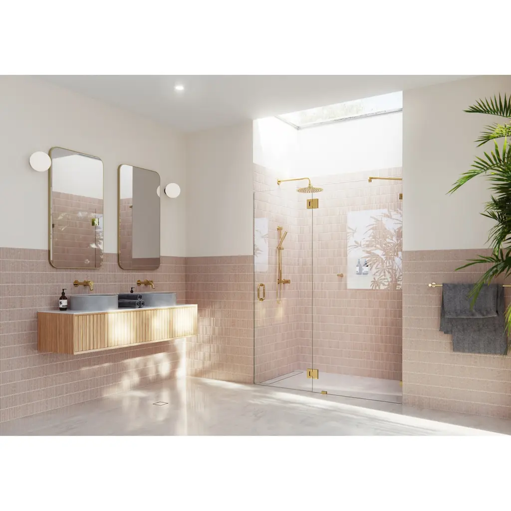 Highlight the fixtures in your bathroom with the understated minimalism of a glass-hinged corner shower enclosure. This frameless 3/8” tempered glass panels come in a standard 78” height. At the same time, the flexibility of a glass-hinged panel allows room for wall accessories or a design that doesn't suit a wall-hung door. Glass is treated on both sides with EnduroShield coating, which aids in repelling water and soap residue, allowing the panels to be fully reversible. In addition, the superior quality solid brass hardware is available in a variety of color finishes to suit any bathroom. With extensive range of frameless shower door and panel sizes, the Halo walk-in enclosure by Glass Warehouse is perfect for any space, creating a light and airy feel to your bathroom.Glass Warehouse GW-GH-57.5 Features:Glass Warehouse GW-GH-57.5 Specifications: