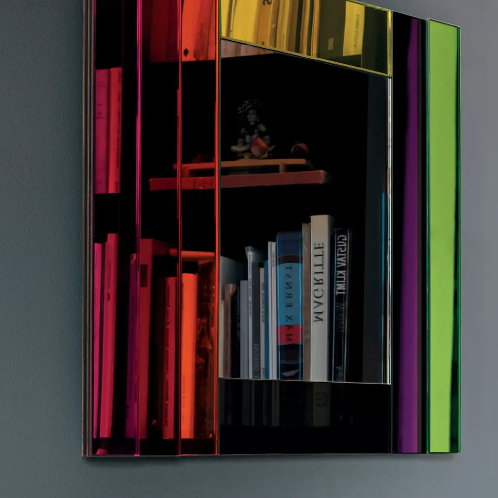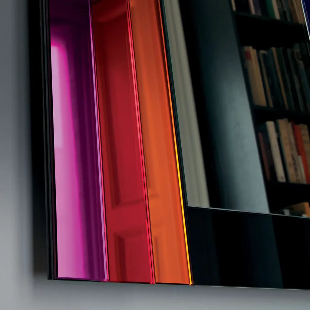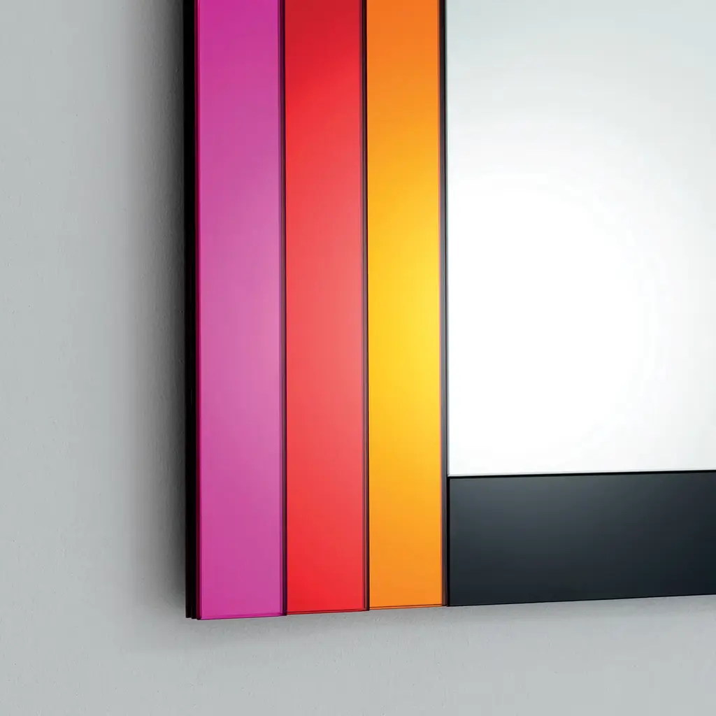 The Gli Specchi di Dioniso Collection designed by Ettore Sottsass includes six mirrors in different shapes and sizes characterizes by polychromatic frames. Perfect to add a stylish and vivacious touch to any interior dominated by a neutral or monochromatic palette, this version number 3 boasts a rectangular mirror framed with slim rectangular slats of polished lacquered glass and laminated colored mirror.