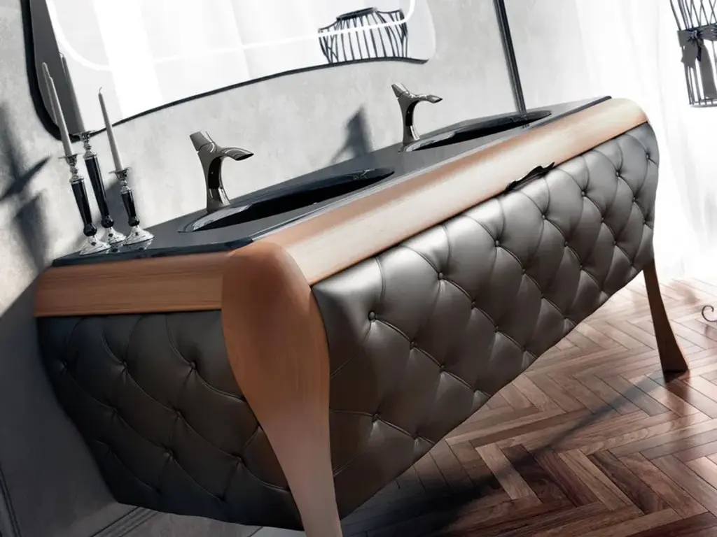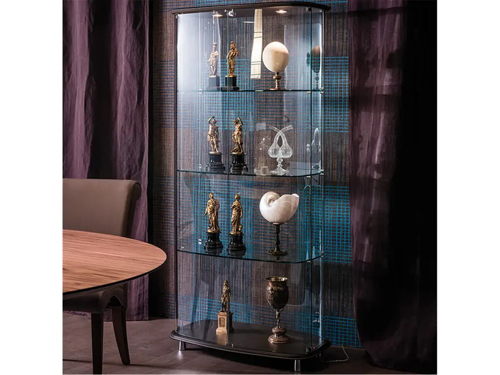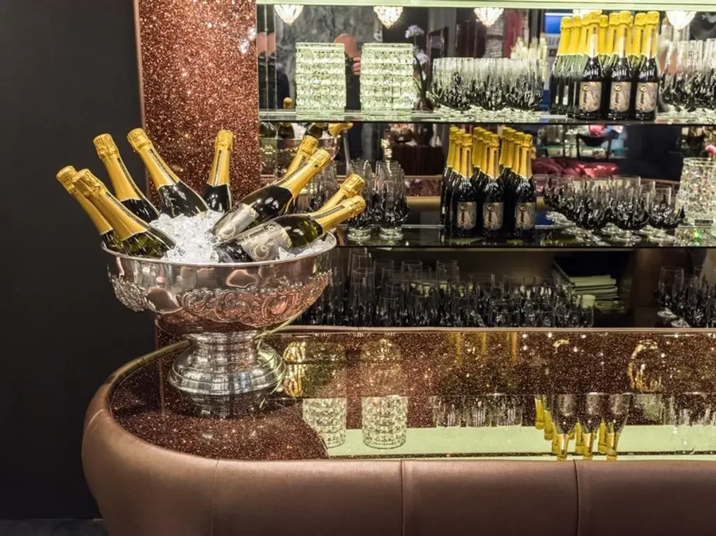 Back bar furniture: LED backlit with multilayer structure, glitter glass door, washable fabric sides, mirrored back and interior, bronzed glass shelves and glossy brass base.7511965.00 -- 255 x 37 x H. 220 cmBar counter: glitter glass top, structure made of waterproof panels covered with technical washable fabric in capitonné finish and glossy brass base.7542565.85 -- 240 x 60 x H. 110 cm