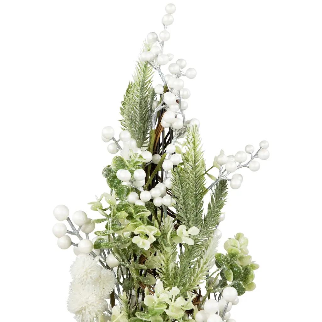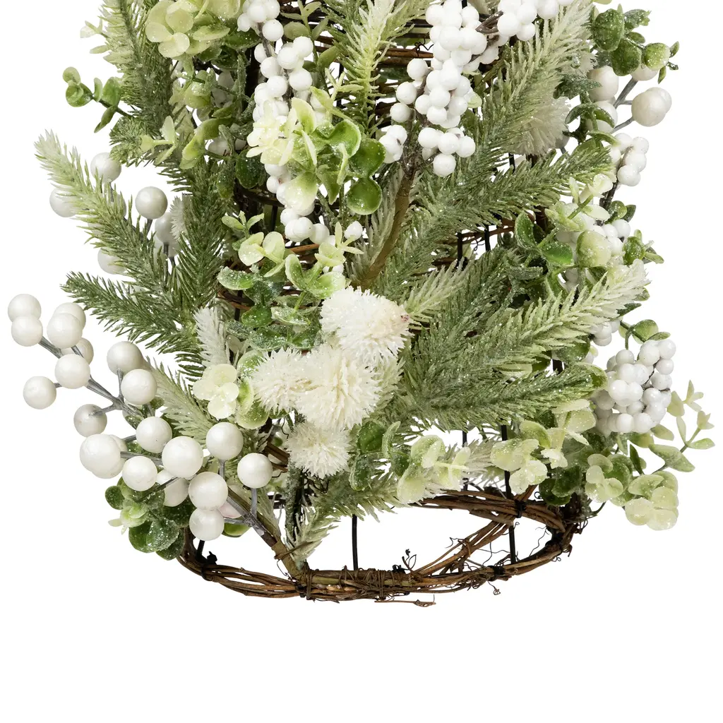 Transform your holiday decor with our enchanting artificial cone Christmas tree. Crafted with care, a delicate grapevine twig wraps around a sturdy metal cone, creating a rustic yet elegant foundation. Adorned with lush green pine branches, eucalyptus leaves, and the whimsical touch of white thistle and berries. This tree brings the spirit of the season to life. The finishing touch of iridescent glitter adds a magical sparkle, making it a unique and festive centerpiece for your celebrations. Embrace the charm of nature with a touch of holiday magic with this stunning Christmas tree. Product Features: Christmas tabletop cone tree Showcases a twig grapevine wrapped cone Decorated with pine, eucalyptus, thistles and berries Accented with iridescent glitter For indoor use only Dimensions: 27" high by 13" diameter Material(s): metal/plastic/twig/foam