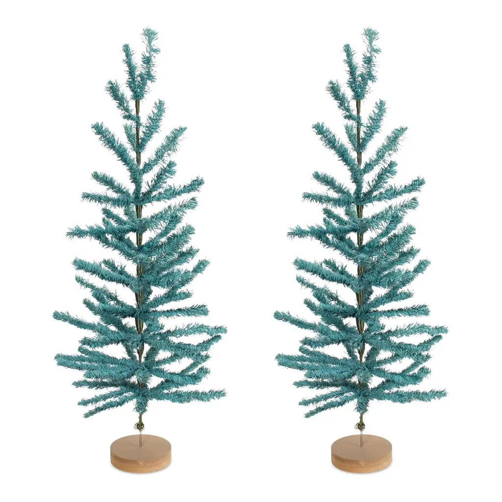 Add a natural element to your winter decor with this stunning set of Bottle Brush Pine Trees. Featuring two assorted sizes, this set is a great fit for your rustic woodland or lodge cabin style of holiday decor. The natural green tones paired with the classic bottle brush design are the perfect combination to create a memorable display. The quality PVC plastic and metal composition is sure to endure for seasons to come. Display the pieces on your mantle or bookshelf to make a statement, or gift them to someone special to spread the holiday cheer.