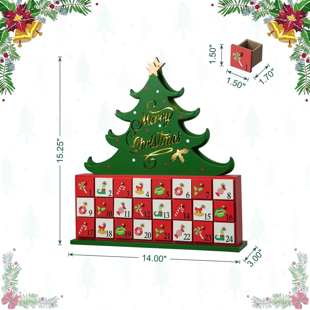 This lighted Christmas countdown calendar is a delightful and festive addition to your holiday decor. Designed in the shape of a Christmas tree, it adds a touch of whimsy and charm to any space. The LED lights embedded in the design create a warm and enchanting glow, enhancing the joyful atmosphere of the holiday season.One of the standout features of this calendar is the presence of 24 small drawers. Each drawer provides the perfect space to hide a surprise gift, adding an element of excitement and anticipation to the countdown.The numbered drawers allow you to easily keep track of the days leading up to Christmas, adding a sense of anticipation and excitement to the holiday season.Features: Dimensions: Brand Profiles:Glitzhome is a US registered trademark based in Texas USA. We are the professional designer and crafter of home decor products with more than 10 years'experience. Hope you could find your favorite items to add some fresh elements to your home.