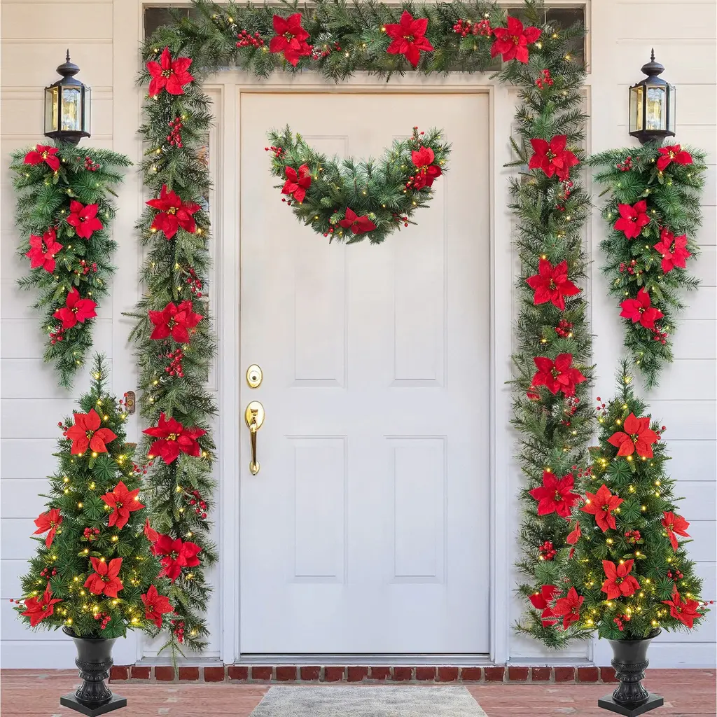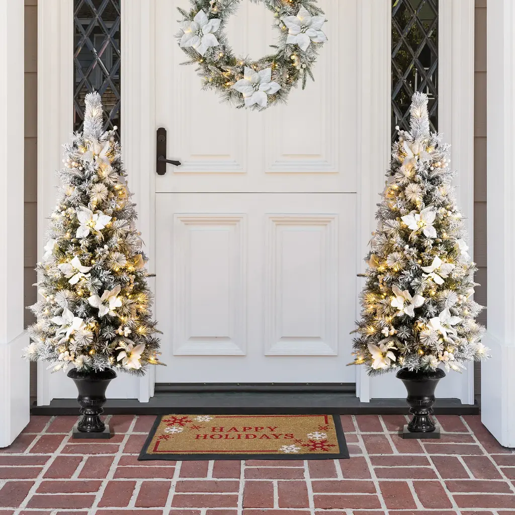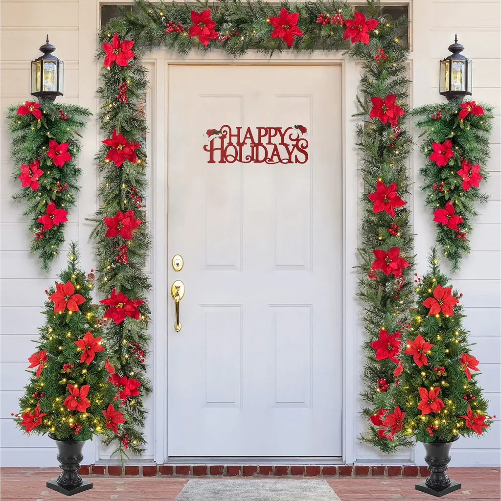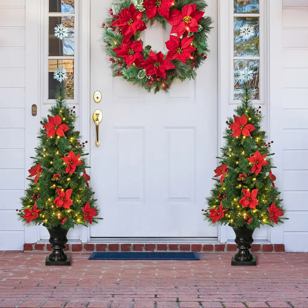 Glitzhome 4Ft Pre-Lit Pine Artificial Christmas Potted Porch Trees W/ Poinsettia - 4Ft Tree