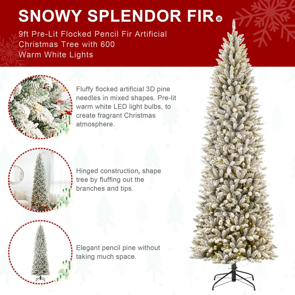 Glitzhome 6Ft/7.5ft/9ft/11ft Snow Flocked Pre-Lit Artificial Fir Christmas Trees - 9Ft Pencil Fir