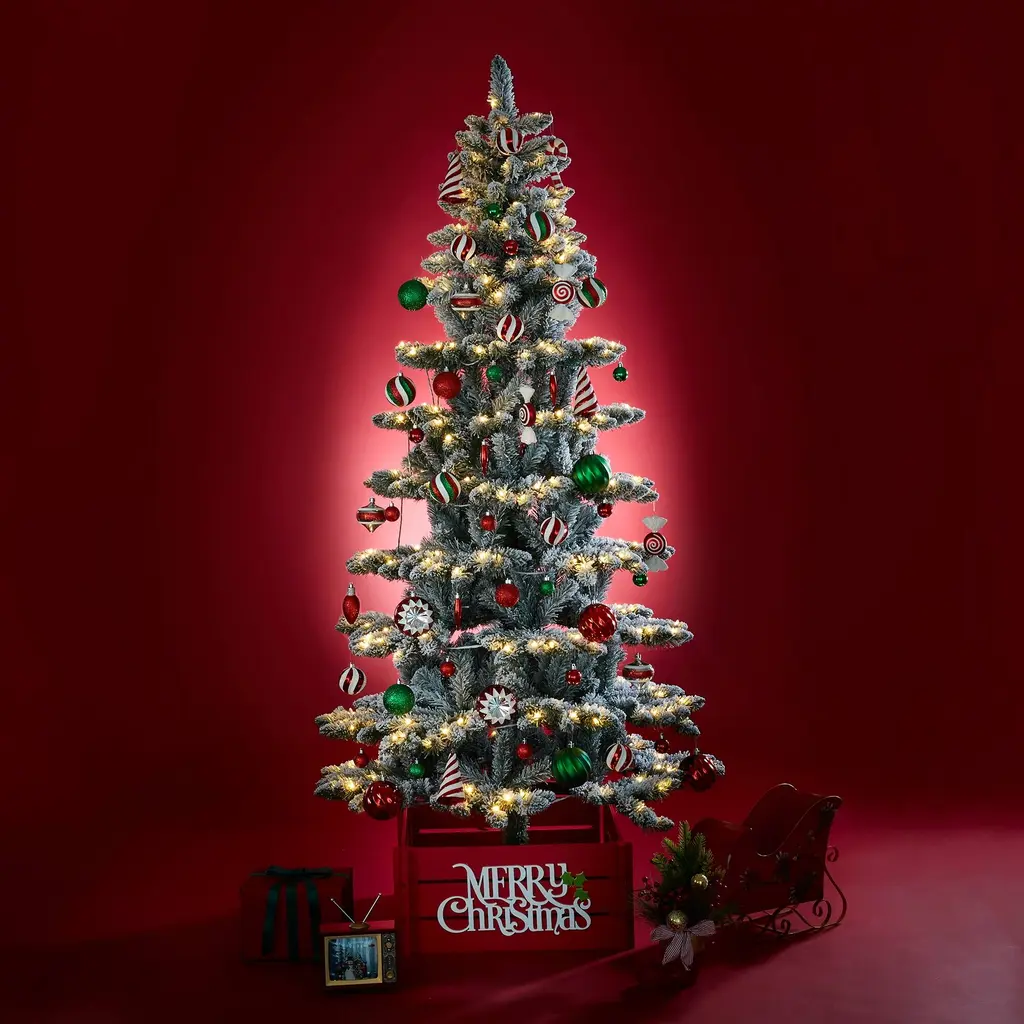 This 7.5ft or 9ft Pre-Lit Snow Flocked slim spruce Artificial Christmas tree create a unique wintery feel, it will be an eye-catching addition to any room during the Christmas holidays.Features:Specifications for Tree:Specifications for Ornaments:Brand Profiles: