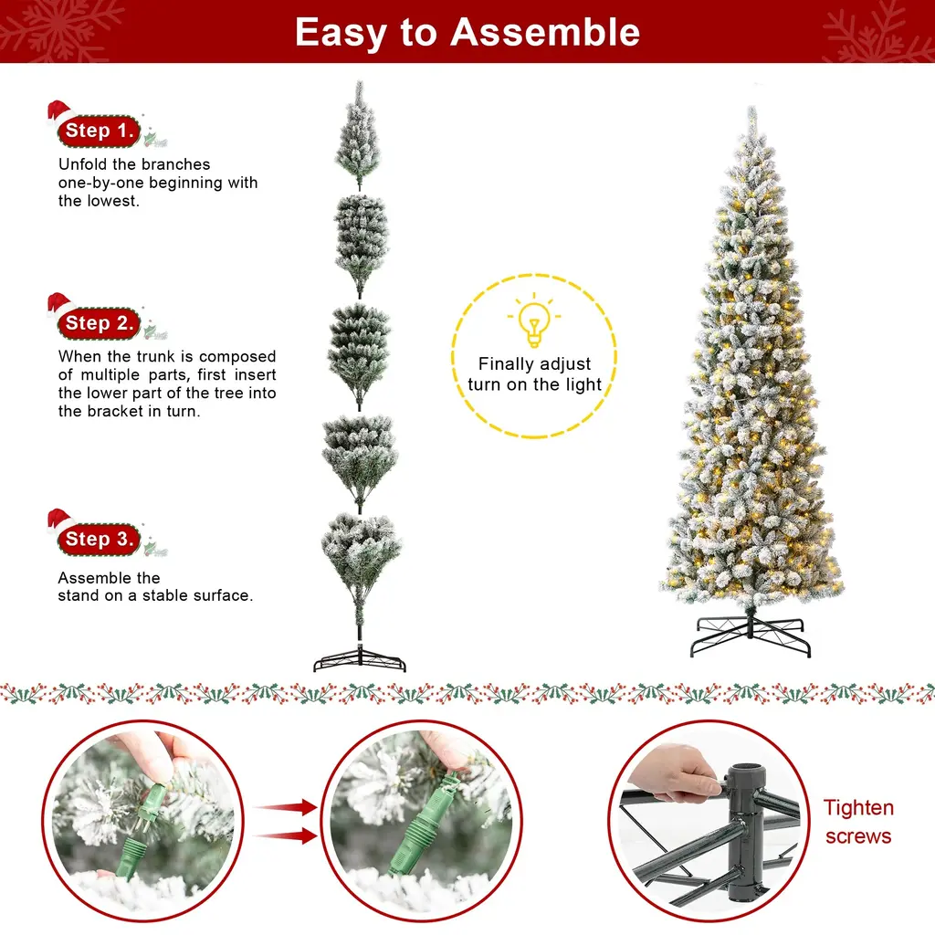 This 7.5FT/9FT/11FT Pre-Lit Green Pine Artificial Christmas tree creates a unique wintery feel, it will be an eye-catching addition to any room during the Christmas holidays. Illuminate your decor by adding a festive ambiance to your surroundings with this lighted artificial Christmas tree. The ambient glow from these luminaries is sure to create the mood for celebrating the season. Place it in your favorite spot and garner good compliments from everyone who glances.Features: 9 lighting modes With Remote ControllerSpecifications:- 7.5 Foot Flocked:- 9 Foot Flocked:- 11 Foot Flocked:- 7.5 Foot Frosted:- 9 Foot Frosted:Brand Profiles:Glitzhome is a US-registered trademark based in Texas USA. We are professional designers and crafters of home decor products with more than 10 years of experience. Hope you could find your favorite items to add some fresh elements to your home.