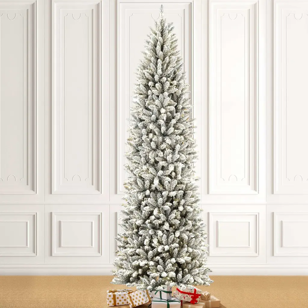 Glitzhome 9Ft Pre-Lit Flocked Pencil Fir Artificial Christmas Tree With 600 Warm White Lights - 9 Foot