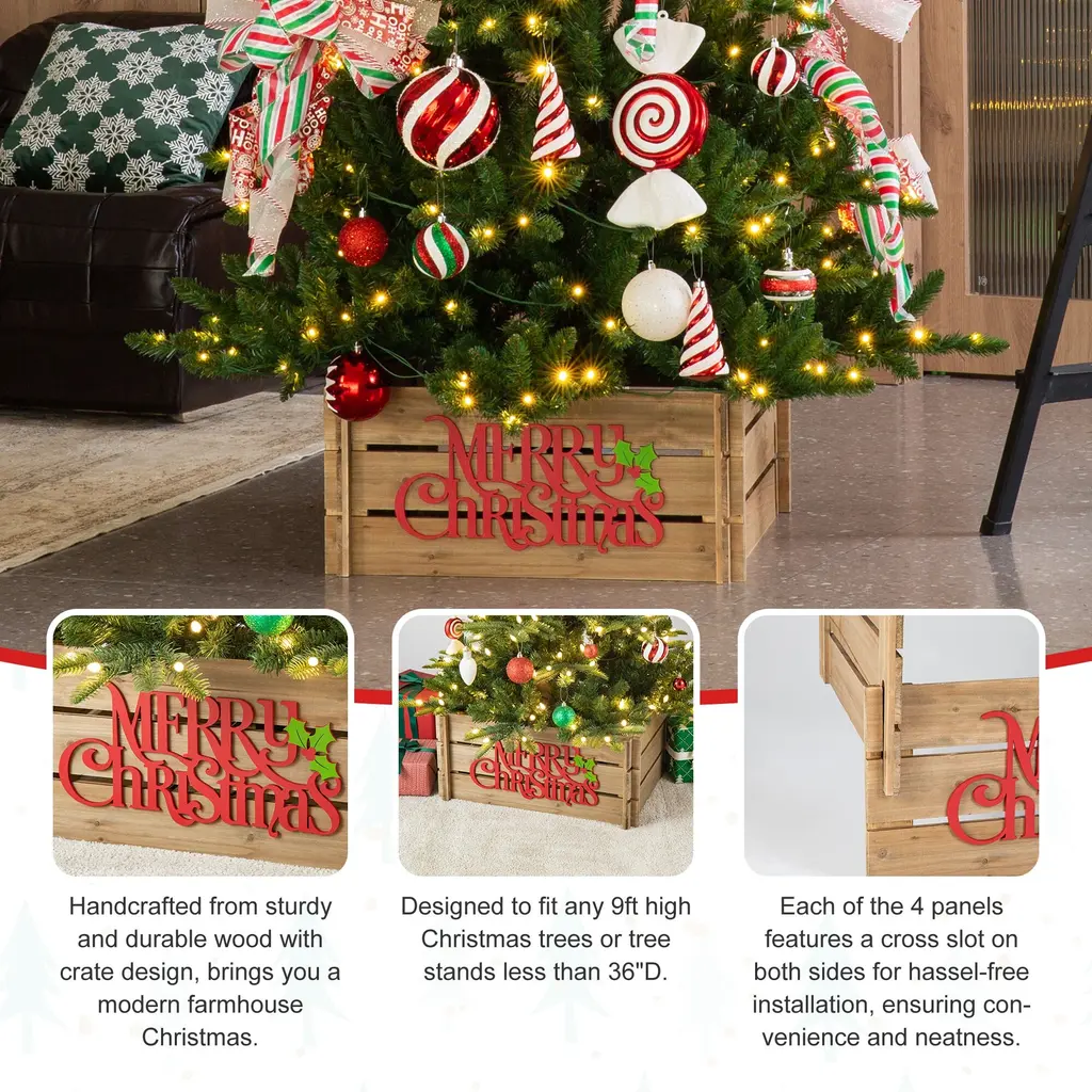 It's handcrafted from MDF or solid wood with crate design, brings you a modern farmhouse Christmas. Made for 7.5ft or 9ft high trees for variety of shapes or colors. Each of the 4 panels features a cross slot on both sides for hassel-free installation, ensuring convenience and neatness.Features:Specifications:Brand Profiles: