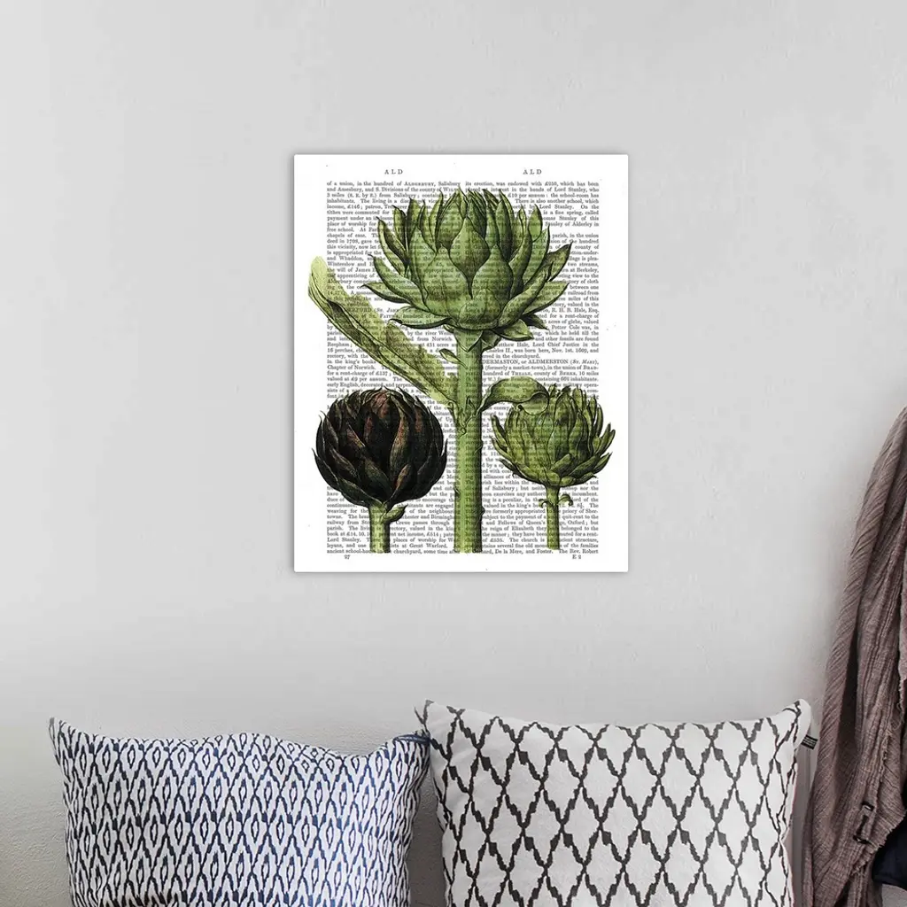 Botanical illustration of artichokes painted over a vintage dictionary page.