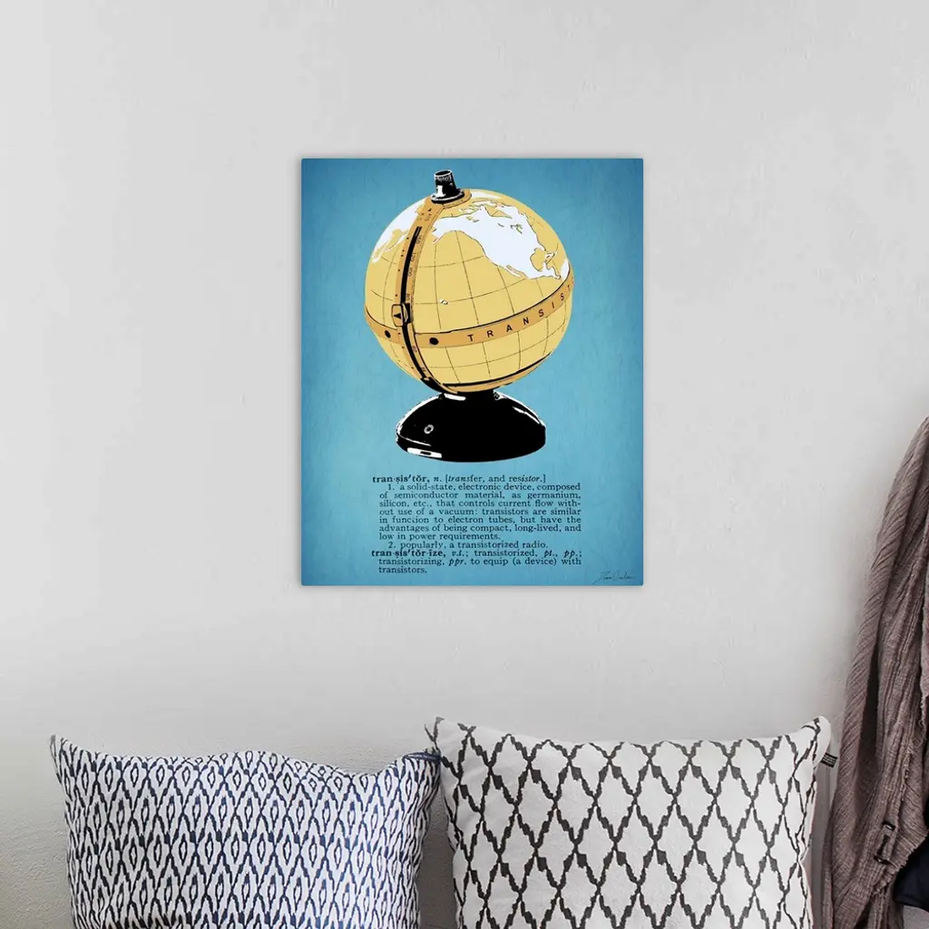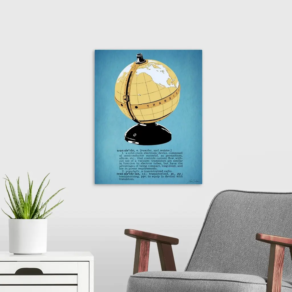 Retro-style illustration of a globe radio with the dictionary definition below the image.