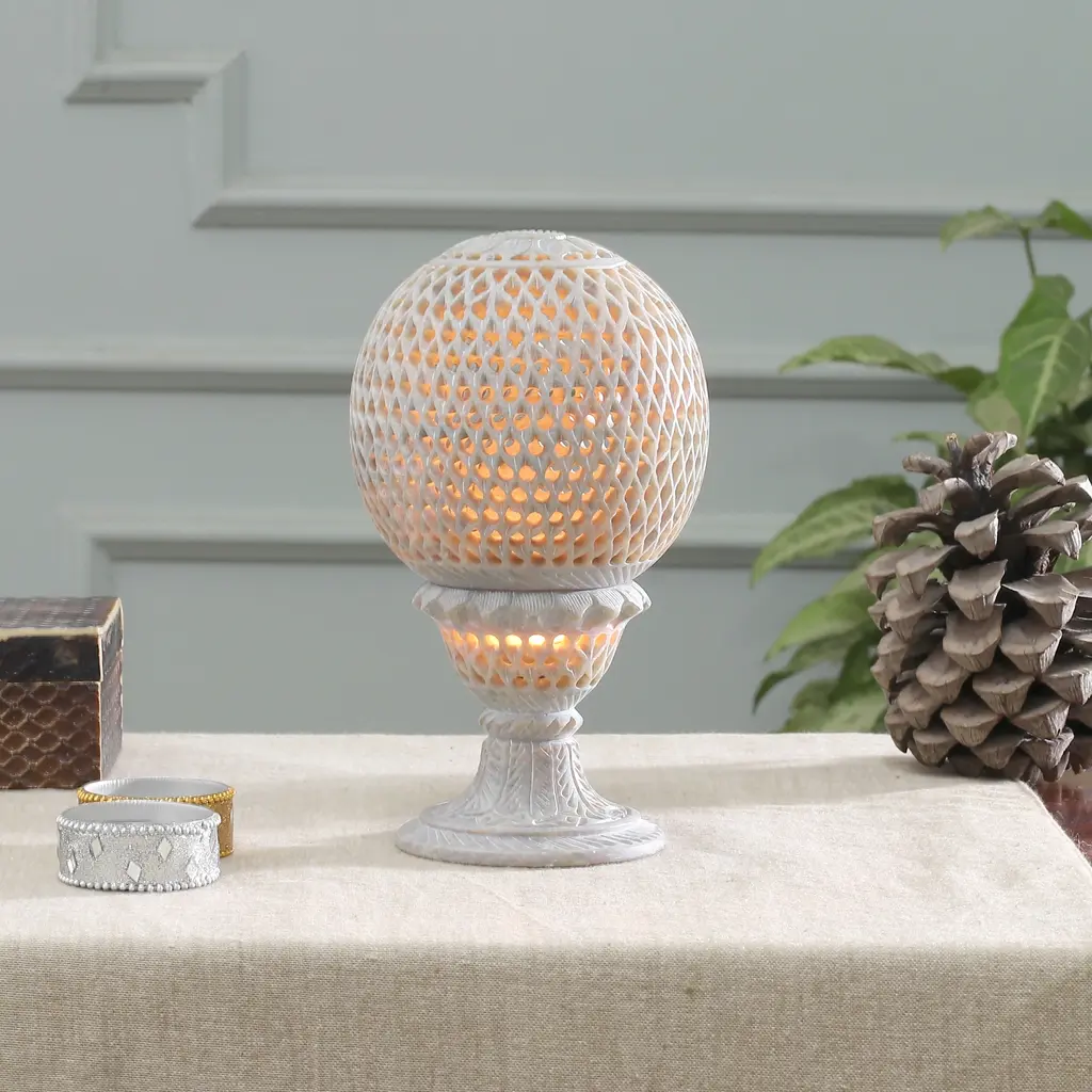 Behold a luminous marvel—Gulam Rasool's hand-carved soapstone tealight holder that transforms ordinary candlelight into enchanting patterns dancing across your walls. Meticulously crafted with traditional Indian jali techniques, this hollow orb creates a mesmerizing interplay of shadow and flame when a tealight flickers within its delicate stone lattice. Agra's ancient artistry of soapstone carving meets modern home decor in this mystical accessory that bathes your space in warm, patterned radiance.
