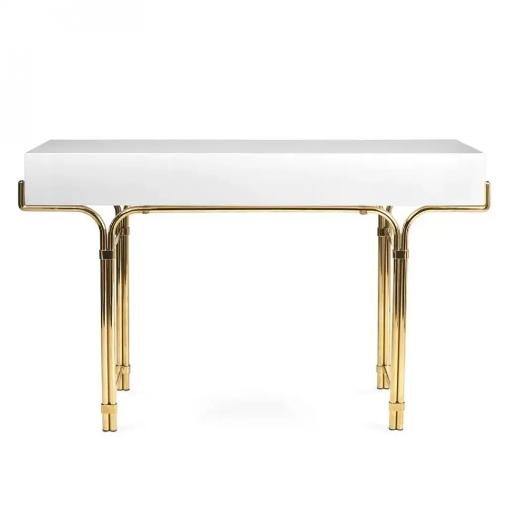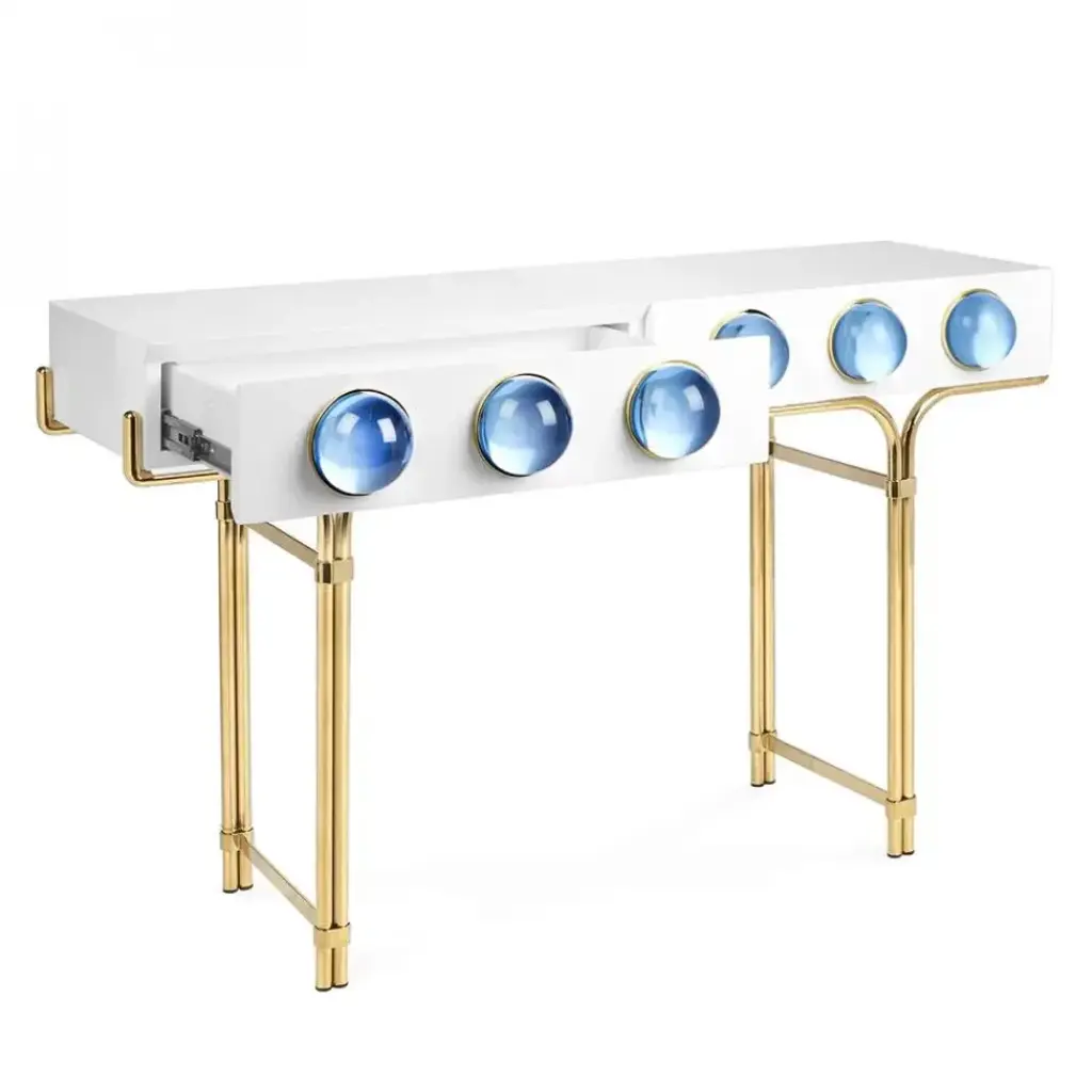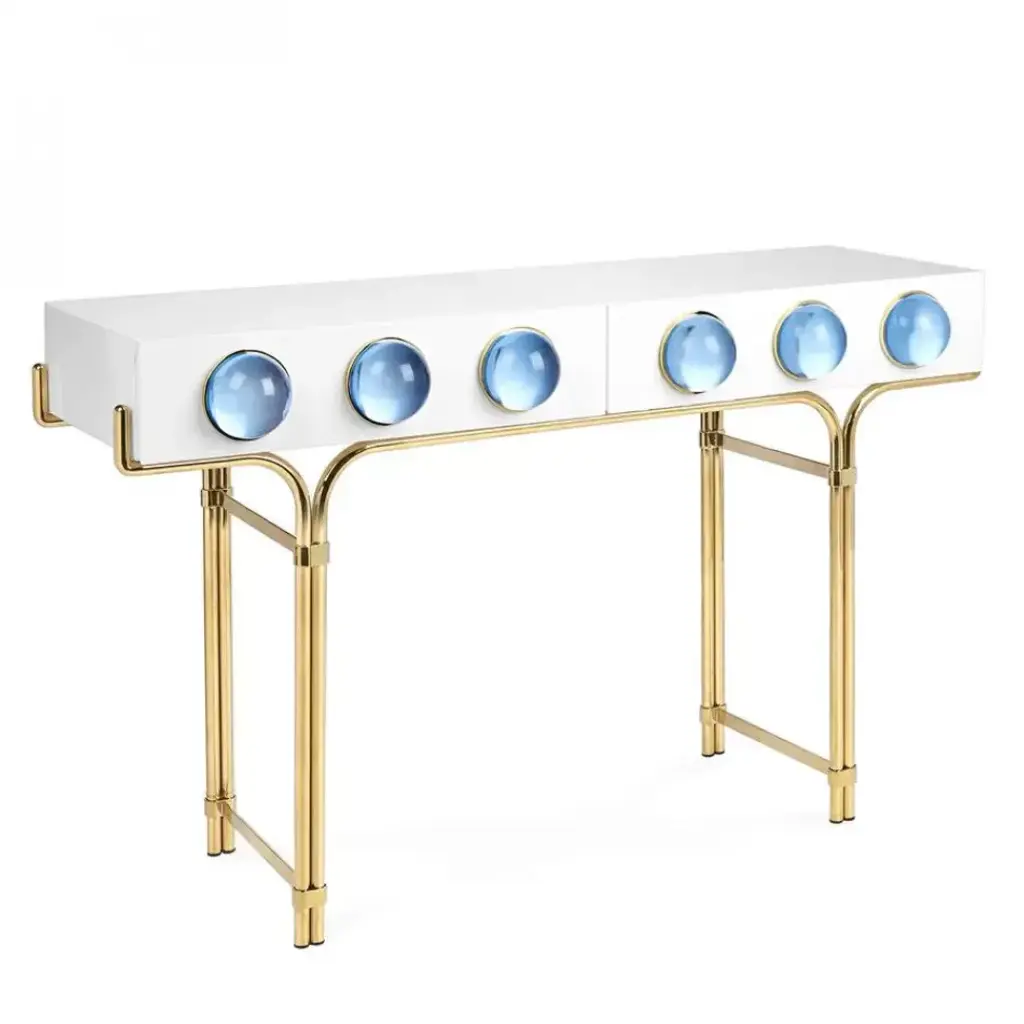 A glossy, white lacquer cabinet cradled by a sinuous brass framework and capped with blue solid acrylic cabochons. Small footprint but big impact, our Globo Console is guaranteed to deliver mega glamour.