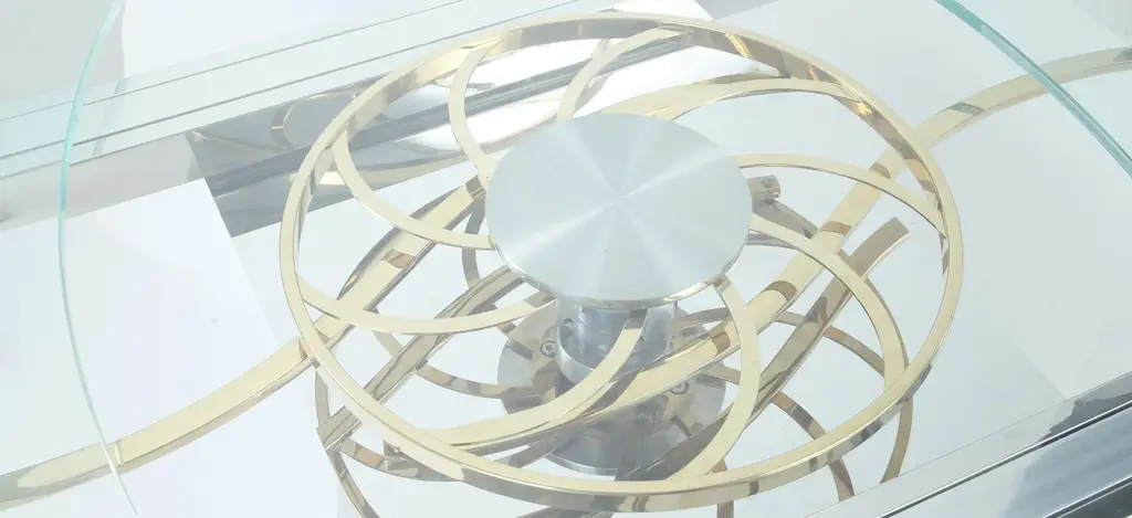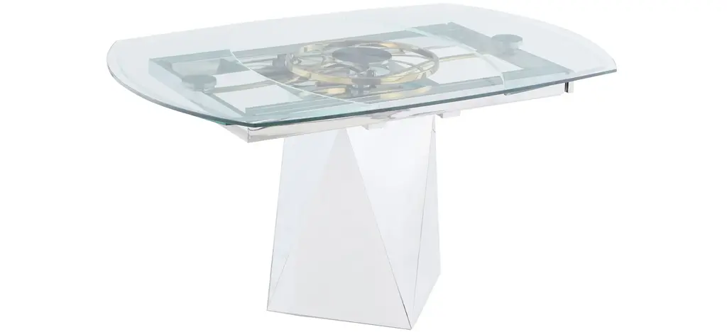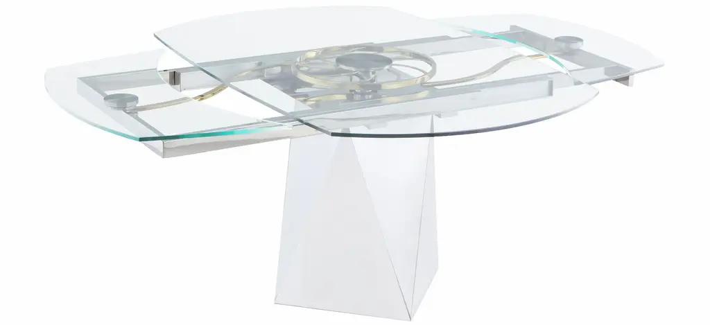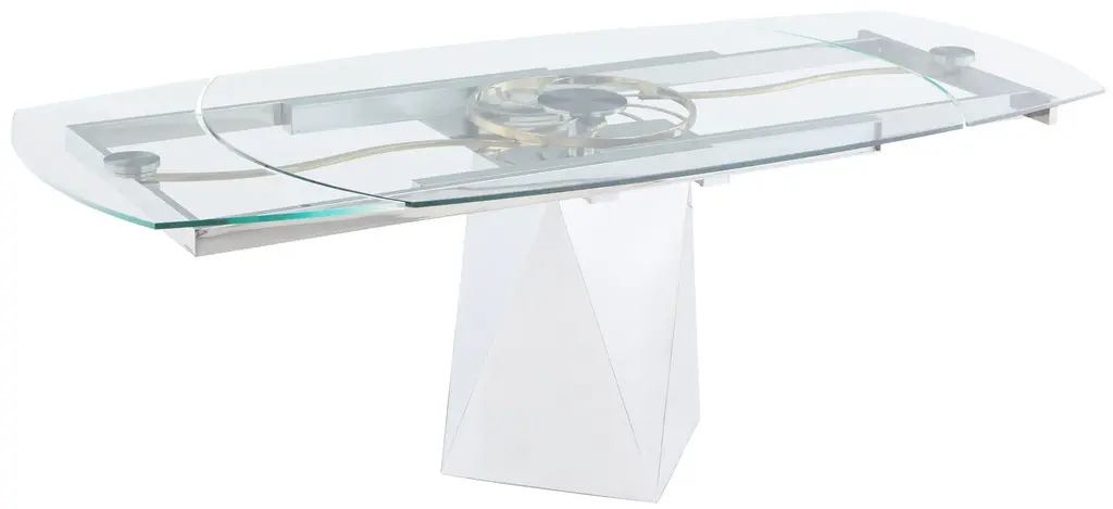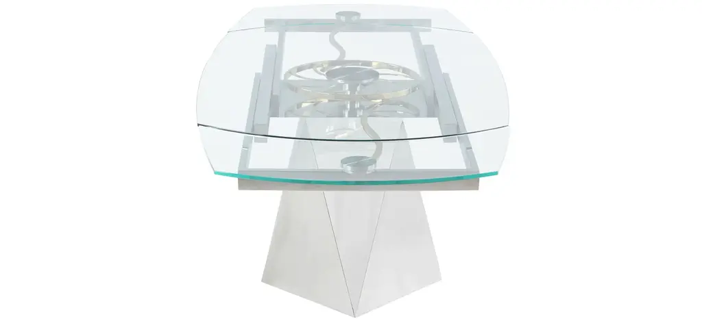 This Gloria table has a 1/2" thick, tempered glass top with two motion-activated extensions, easily opened by one person from 59" to 86" with self-guided tracks for simple and smooth movement, mounted on a polished stainless steel pedestal base.