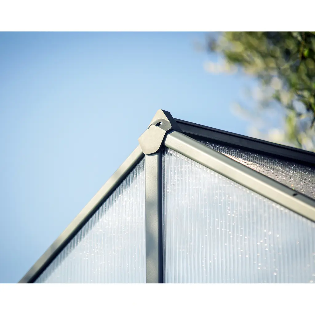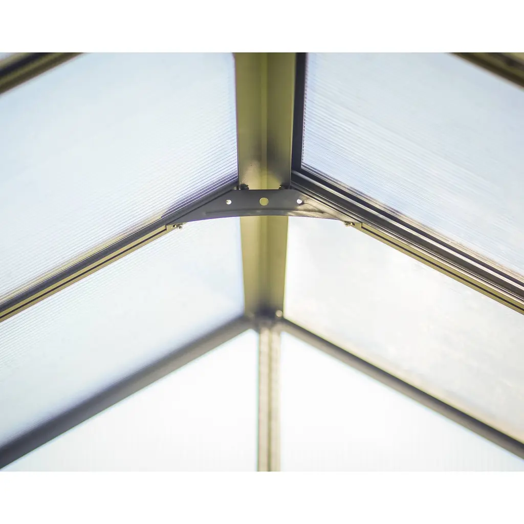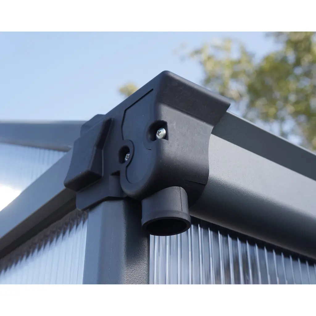 Discover the Excellence of the Glory Greenhouse: Your Partner for Superior Backyard GardeningTransform your gardening with the Glory Greenhouse, meticulously designed to offer the best in comfort, growth, and resilience. With a spacious entrance and thoughtfully included accessories, you'll enjoy perfect ventilation and effortless control over moisture and temperature, essential for thriving plants.Elevate Your Gardening Experience:• Enhanced Growing Space: The high roof and extended eaves not only add elegance but also provide significant headroom and space, allowing you to grow tall and lush plants with ease.• Durable Design: Crafted with an eye for beauty and longevity, the gray powder-coated aluminum framework is both stylish and sturdy, ensuring your gardening pleasure for years to come.• Stability and Support: An included steel base kit enhances height, adds critical support, and ensures your greenhouse remains stable and aligned in any weather.• Unmatched Durability: Our twin-wall polycarbonate panels are virtually indestructible, hail-resistant, and UV protected, offering unmatched protection and optimal insulation.• Superior Frame Strength: With an aluminum frame that's 50% thicker than standard, our greenhouse withstands corrosion and maintains a rigid structure for reliability.• Ample Space for Growth: Enjoy a vast interior with a high ceiling (103") and tall eaves (73.4"), perfect for trellising your favorite tall plants.• Accessibility: The wide entrance door (31.5" W x 74" H) and low threshold ensure easy access, whether you're using a wheelbarrow or wheelchair.• Weather-Ready: An integrated anchoring system, along with an external kit, offers unparalleled support and stability through harsh conditions.• All-Inclusive Accessories: Comes complete with roof vents, automatic vent openers, a side louvre window, plant hangers, and an anchoring kit for a comprehensive gardening solution.• Sustainable Features: Large closed gutters and gutter heads allow for rainwater collection, promoting a sustainable irrigation practice.• Maintenance-Free: Spend more time gardening and less on upkeep with our easy-to-install, maintenance-free design.