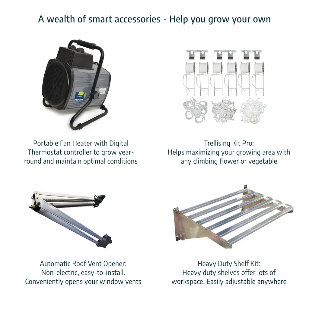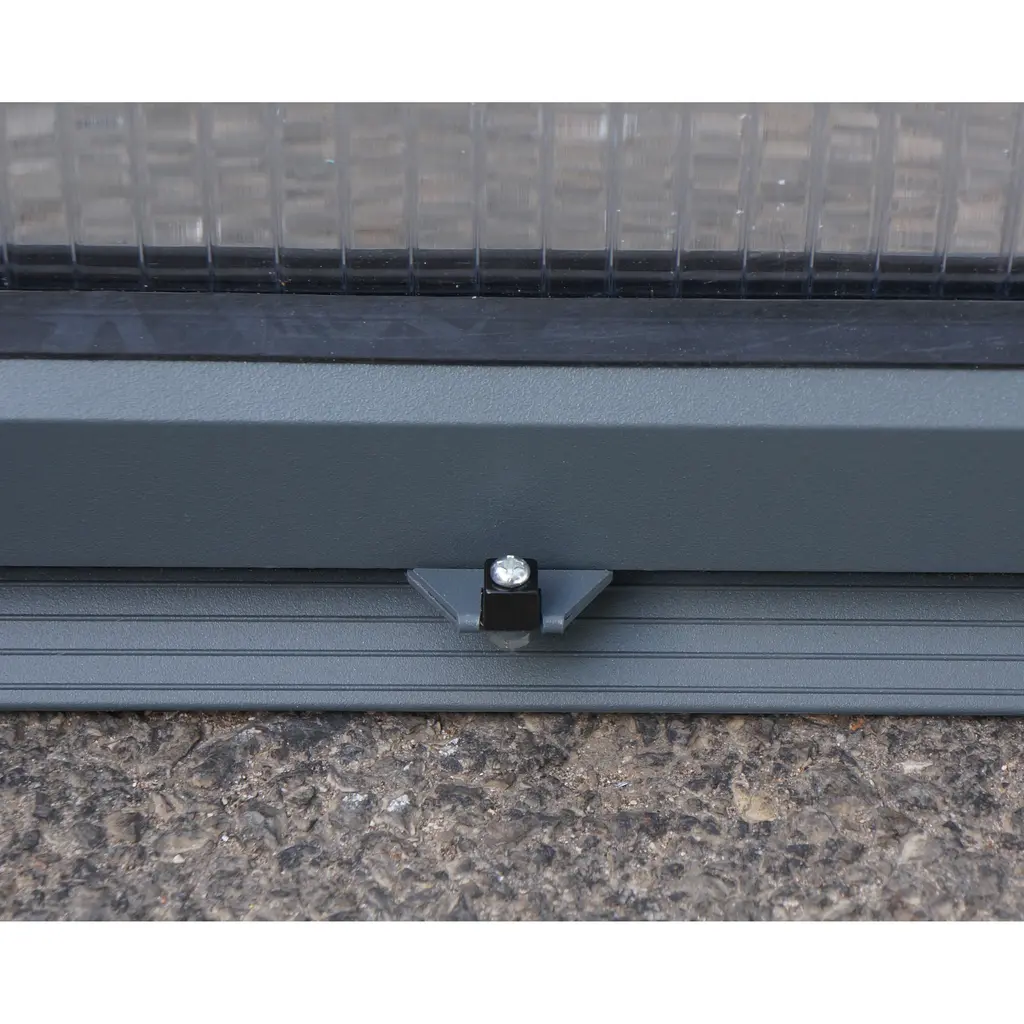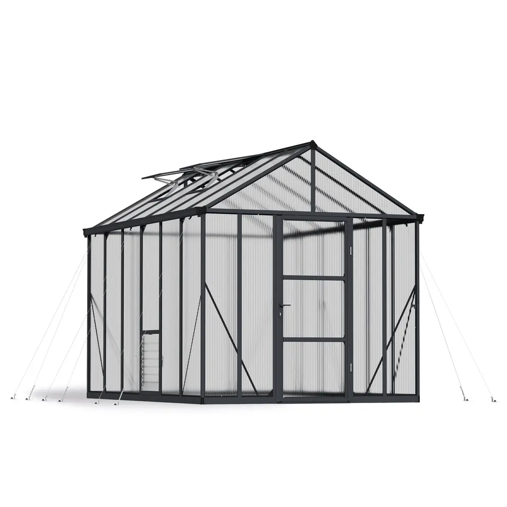 Discover the Excellence of the Glory Greenhouse: Your Partner for Superior Backyard GardeningTransform your gardening with the Glory Greenhouse, meticulously designed to offer the best in comfort, growth, and resilience. With a spacious entrance and thoughtfully included accessories, you'll enjoy perfect ventilation and effortless control over moisture and temperature, essential for thriving plants.Elevate Your Gardening Experience:• Enhanced Growing Space: The high roof and extended eaves not only add elegance but also provide significant headroom and space, allowing you to grow tall and lush plants with ease.• Durable Design: Crafted with an eye for beauty and longevity, the gray powder-coated aluminum framework is both stylish and sturdy, ensuring your gardening pleasure for years to come.• Stability and Support: An included steel base kit enhances height, adds critical support, and ensures your greenhouse remains stable and aligned in any weather.• Unmatched Durability: Our twin-wall polycarbonate panels are virtually indestructible, hail-resistant, and UV protected, offering unmatched protection and optimal insulation.• Superior Frame Strength: With an aluminum frame that's 50% thicker than standard, our greenhouse withstands corrosion and maintains a rigid structure for reliability.• Ample Space for Growth: Enjoy a vast interior with a high ceiling (103") and tall eaves (73.4"), perfect for trellising your favorite tall plants.• Accessibility: The wide entrance door (31.5" W x 74" H) and low threshold ensure easy access, whether you're using a wheelbarrow or wheelchair.• Weather-Ready: An integrated anchoring system, along with an external kit, offers unparalleled support and stability through harsh conditions.• All-Inclusive Accessories: Comes complete with roof vents, automatic vent openers, a side louvre window, plant hangers, and an anchoring kit for a comprehensive gardening solution.• Sustainable Features: Large closed gutters and gutter heads allow for rainwater collection, promoting a sustainable irrigation practice.• Maintenance-Free: Spend more time gardening and less on upkeep with our easy-to-install, maintenance-free design.