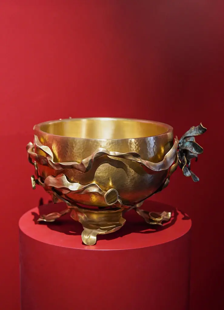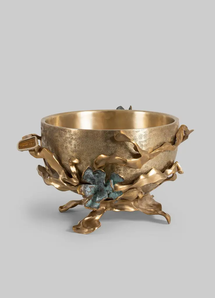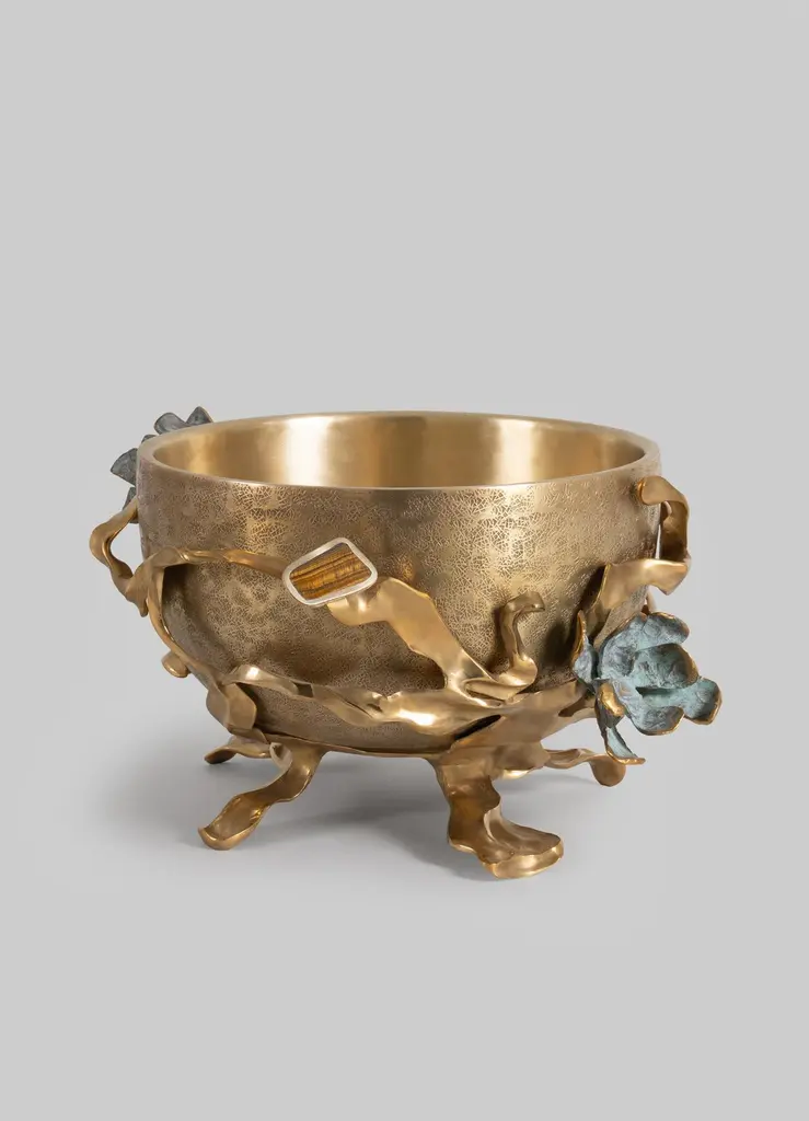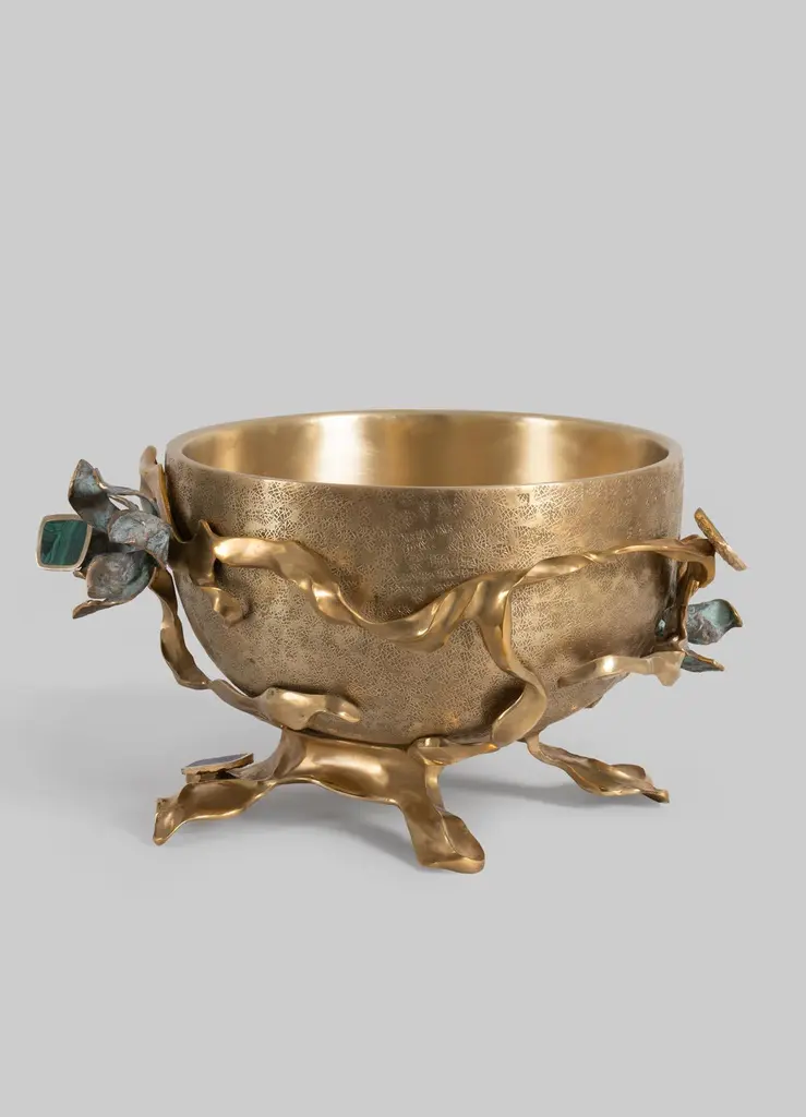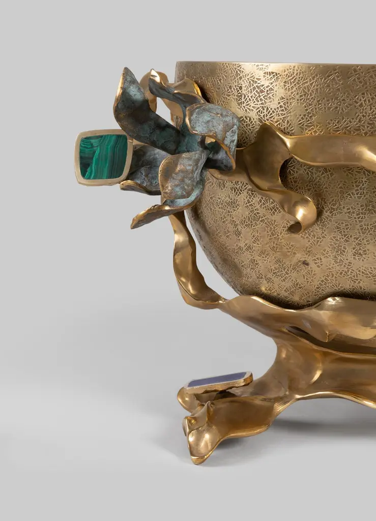 Glory Lily Champagne Bucket in Brass, Viya by Vikram GoyalThe Glory Lily flower dances in paradox, embodying breathtaking beauty and potent power. A striking climber, it isn’t your typical delicate flower, holding medicinal properties to cure many ailments. Our collection mirrors its dramatic, yet slender structure with its twists and curves in myriad shades of patinated cast brass. Like its namesake, this one is also to be admired.Champagne bucket in brass with semi-precious inserts. Handmade in India.Product DetailsMaterial: BrassInlay: Malachite, Red Jasper, Lapiz Lazuli, Tiger EyeSize: 22"DIA x 10"H 55.9 DIA x 25.4 H cmWeight: 12.28 kg 27.016 lbsNumber of Pieces: 1 Champagne BucketSKU: VBO2401This product has been handcrafted by local artisans. As such, slight variations are a testament to the unique character of a piece made by hand.