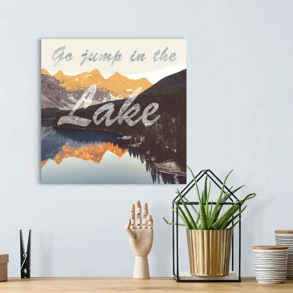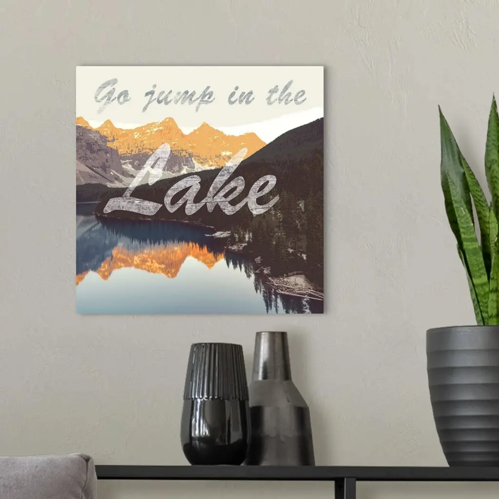 The phrase "go jump in the lake" in script over an image of a mountain lake at sunset.