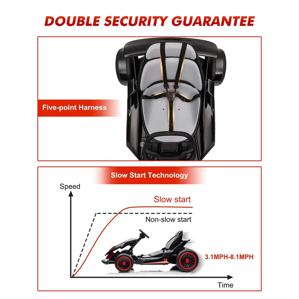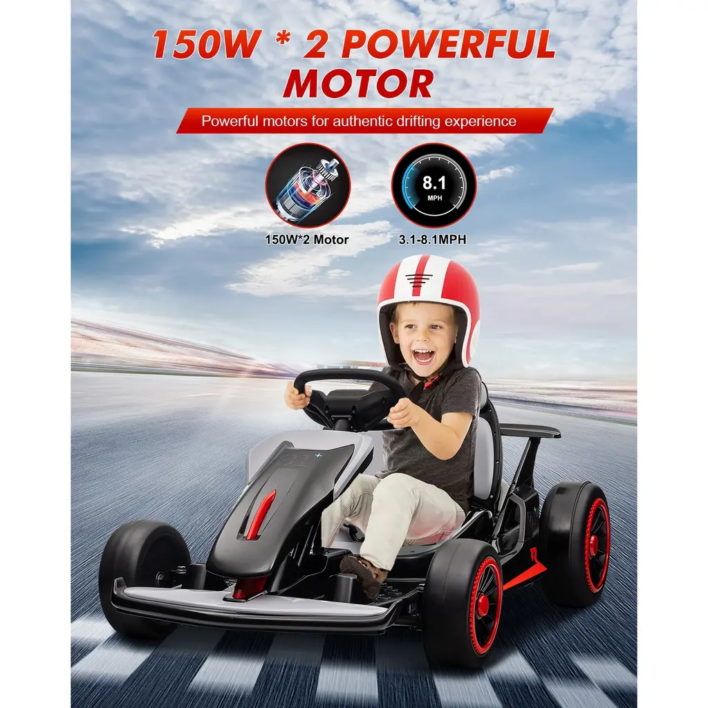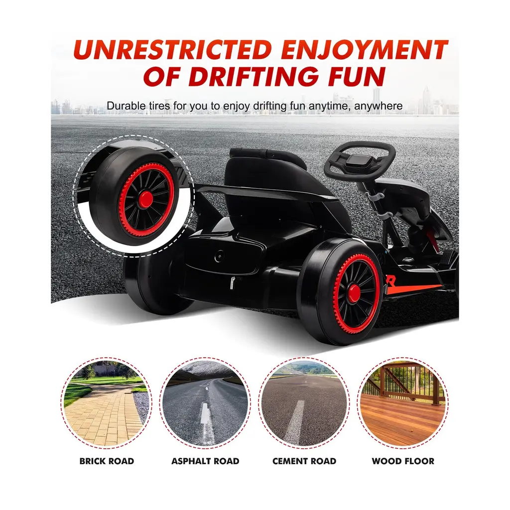 Powerful Performance: Equipped with dual 200W motors and a 7AH battery, this go-kart can achieve a maximum speed of 8.1 MPH, offering kids an exhilarating drifting experience while maintaining safety within a controlled speed range. User-Friendly Controls: The electric go-kart features dual pedals: a gas pedal for acceleration and a brake pedal for immediate stopping. This design allows children to easily control the kart with the steering wheel and manage their speed safely. Enhanced Safety Features: Constructed with a robust plastic and iron frame, this drift kart includes a 5-point seat belt for added security. It supports a maximum load capacity of 110 lbs, making it suitable for children aged 6 and above, ensuring a safe riding experience. 360° Drift Capability: Designed for easy maneuverability, this go-kart allows kids to drift effortlessly. Its low seat position and center of gravity provide stable weight distribution, reducing the risk of tipping over and enhancing stability during fast turns. Multi-Functional Experience: The go-kart offers two adjustable speed modes, allowing children to customize their driving experience. Additionally, it features interfaces for USB flash drives or MP3 players, enabling kids to enjoy their favorite tunes while riding, adding to the fun!