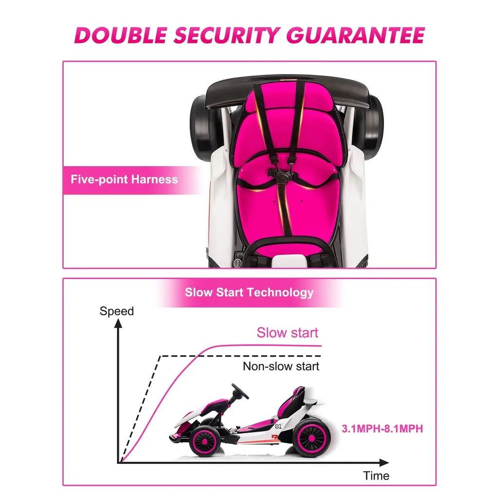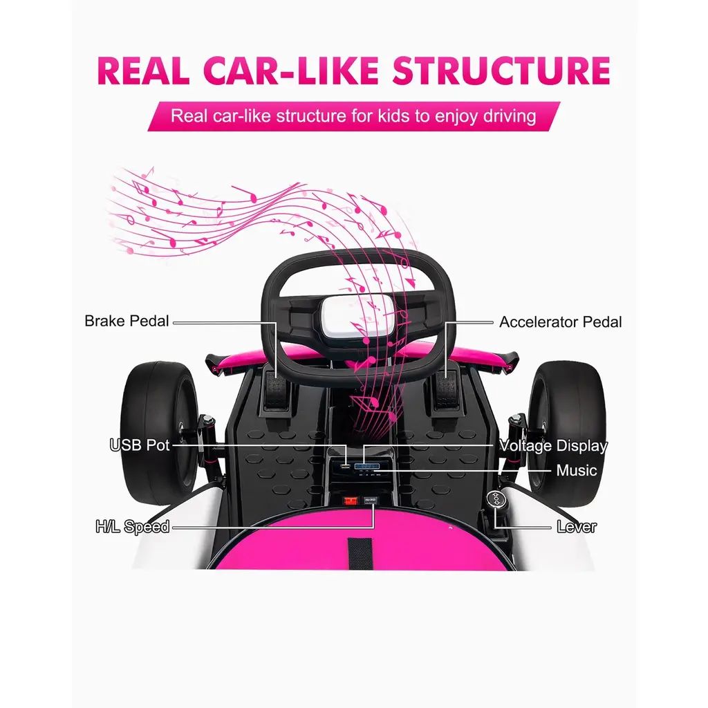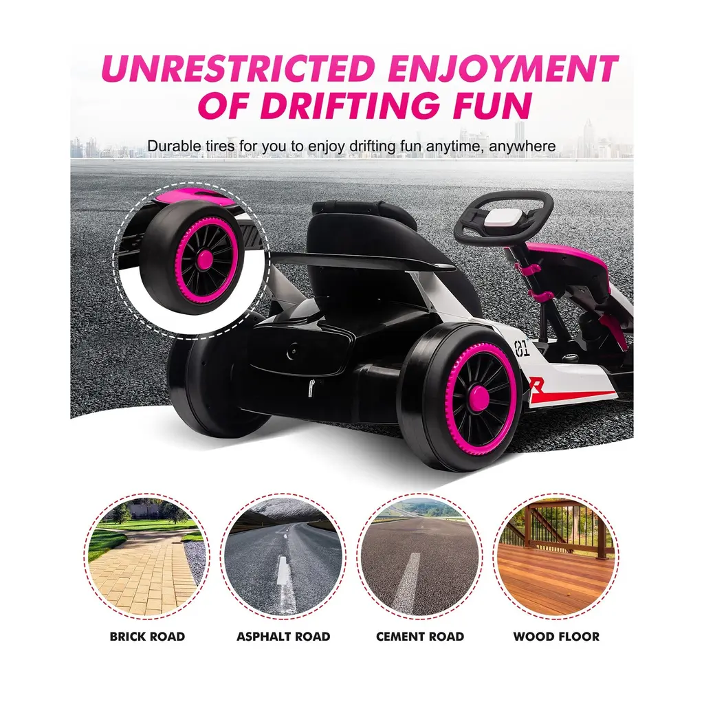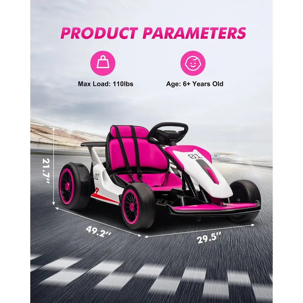 Powerful Performance: Equipped with dual 200W motors and a 7AH battery, this go-kart can achieve a maximum speed of 8.1 MPH, offering kids an exhilarating drifting experience while maintaining safety within a controlled speed range. User-Friendly Controls: The electric go-kart features dual pedals: a gas pedal for acceleration and a brake pedal for immediate stopping. This design allows children to easily control the kart with the steering wheel and manage their speed safely. Enhanced Safety Features: Constructed with a robust plastic and iron frame, this drift kart includes a 5-point seat belt for added security. It supports a maximum load capacity of 110 lbs, making it suitable for children aged 6 and above, ensuring a safe riding experience. 360° Drift Capability: Designed for easy maneuverability, this go-kart allows kids to drift effortlessly. Its low seat position and center of gravity provide stable weight distribution, reducing the risk of tipping over and enhancing stability during fast turns. Multi-Functional Experience: The go-kart offers two adjustable speed modes, allowing children to customize their driving experience. Additionally, it features interfaces for USB flash drives or MP3 players, enabling kids to enjoy their favorite tunes while riding, adding to the fun!