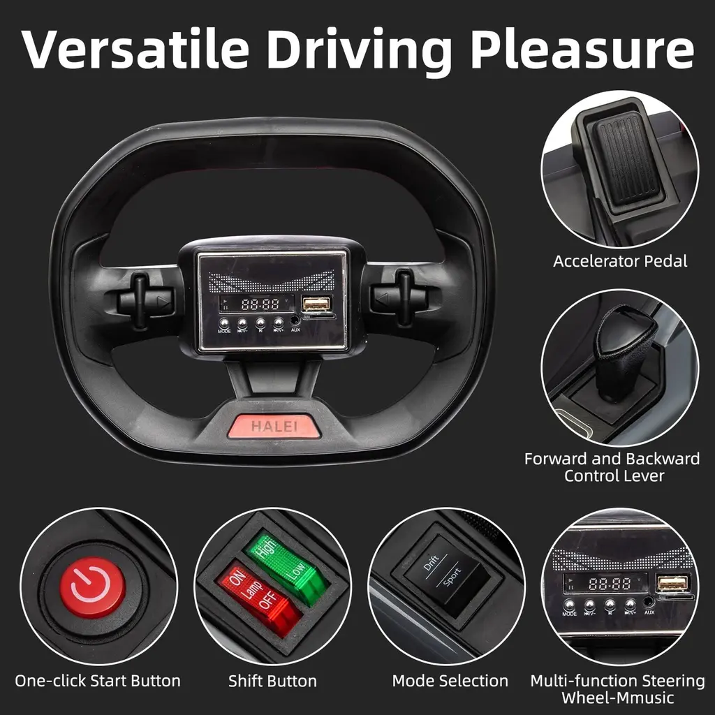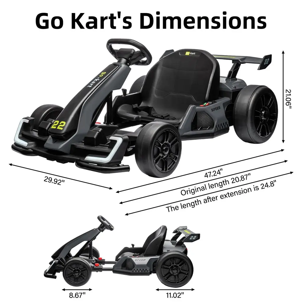 Child safety kart:The go-kart is equipped with a slow start function to effectively reduce starting vibration; it is also equipped with a seat belt to protect children while driving. Touch the accelerator lightly to increase speed, release the accelerator to brake and decelerate, easy to control, easy for children to master. Speed up to 8 MPH:Speed up to 8 miles per hour - Equipped with dual 150W high-power electric motors to inject strong power into your car; high and low speed modes can be switched freely to provide children with dual driving fun. Multifunctional Console:The 24V children's kart have multiple functions such as music, one-button start, USB interface, high and low gear shifting, and MP3 player, bringing children richer and more enjoyable driving fun. 3-Level Length Adjustment:This fun kart is suitable for children aged 6-12 years old. The body is equipped with 3-level height adjustment buttons, allowing every child to find the most comfortable driving position. In addition, it also has dual mode selection functions of high speed/low speed and sports/drift. Great Gift for Kids:The exterior dimensions of this car are 47.2 inches (L) x 29.9 inches (W) x 21.06 inches (H).And it is a ideal birthday or Christmas gift for children aged 6-12.