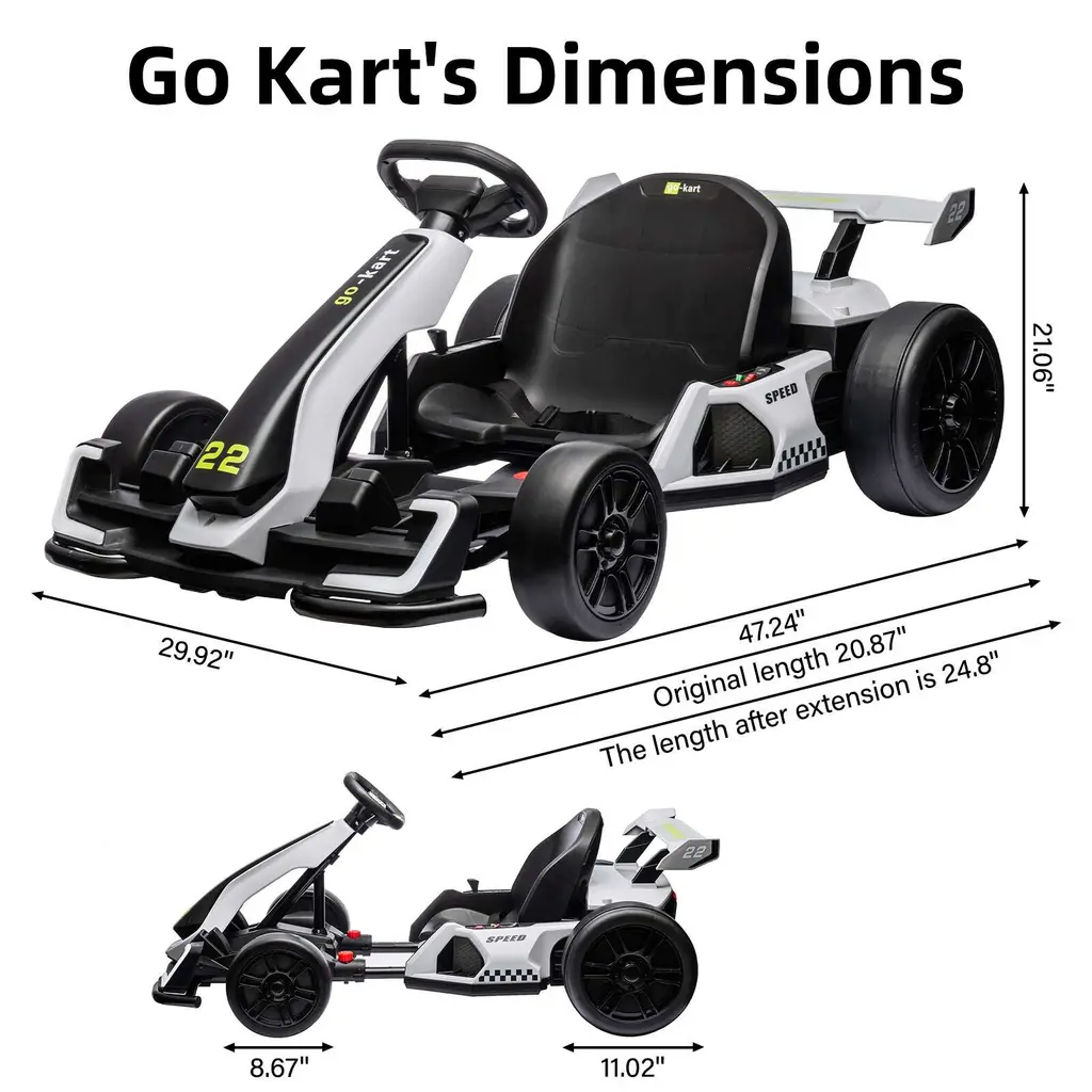 Child Safety Features: Designed with safety in mind, this go-kart includes a slow start function to minimize starting vibrations and a seat belt to securely protect children while driving. The intuitive accelerator makes it easy for kids to control speed—simply press lightly to accelerate and release to brake or decelerate. Impressive Speed Capabilities: The go-kart can reach speeds of up to 8 MPH, powered by dual 150W high-performance electric motors that provide strong acceleration. With both high and low-speed modes, children can switch freely between settings, offering them diverse driving experiences. Multifunctional Console: The 24V children's kart features a multifunctional console that includes music playback, a one-button start function, a USB interface, high and low gear shifting, and an MP3 player. These features enhance the driving experience with entertainment options for kids. 3-Level Length Adjustment: Suitable for children aged 6-12 years, this kart provides adjustable height through three levels, allowing every child to find their most comfortable driving position. It also offers dual mode selections for high/low speed and sports/drift, catering to various preferences. Great Gift for Kids: With overall dimensions of 47.2 inches (L) x 29.9 inches (W) x 21.06 inches (H), this go-kart is an ideal birthday or Christmas gift for children aged 6-12. Its fun design and exciting features make it a perfect addition to any child's playtime activities.