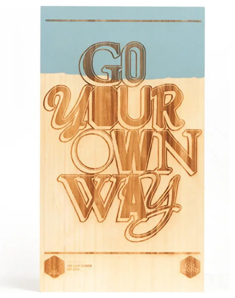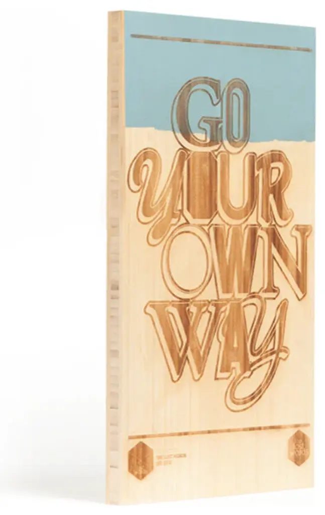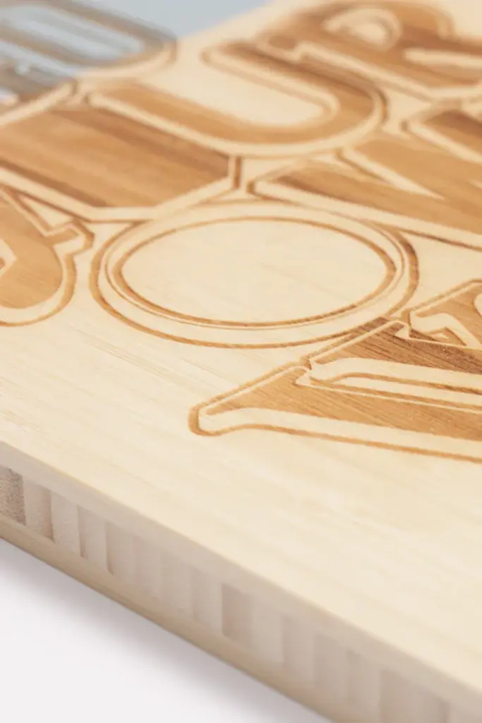 Laser Etched onto a hand sanded and painted board this typographic design will look great hanging on your wall. Produced from sustainably managed bamboo plantations by an FSC certified operator this board is as good for the environment as it is for you. Board comes with routed hanging system in rear which suits all hooks and nails. Dimensions 400mm x 230mm x 15mm.