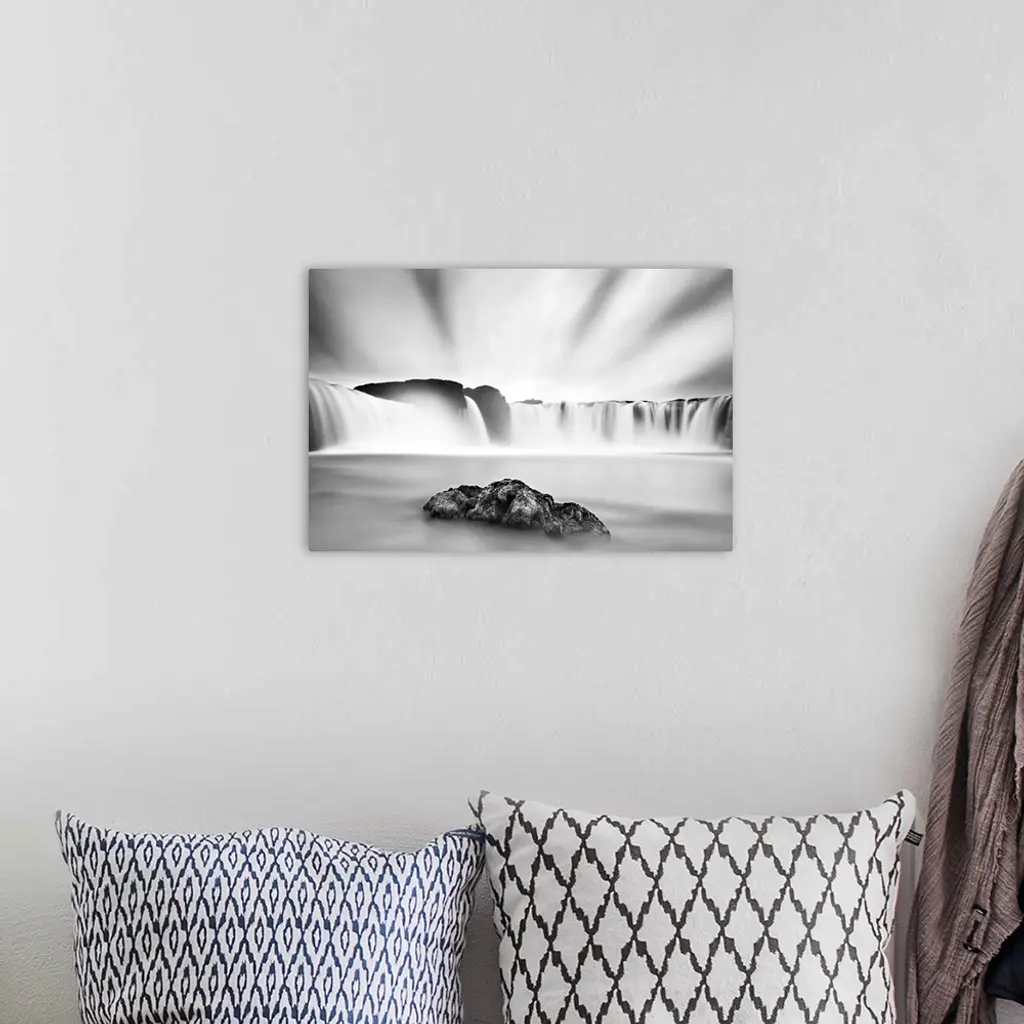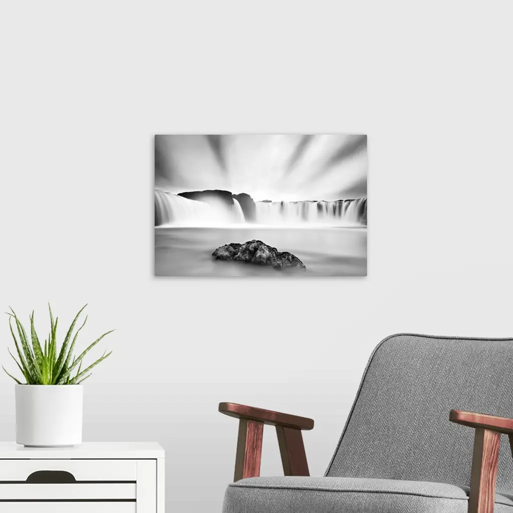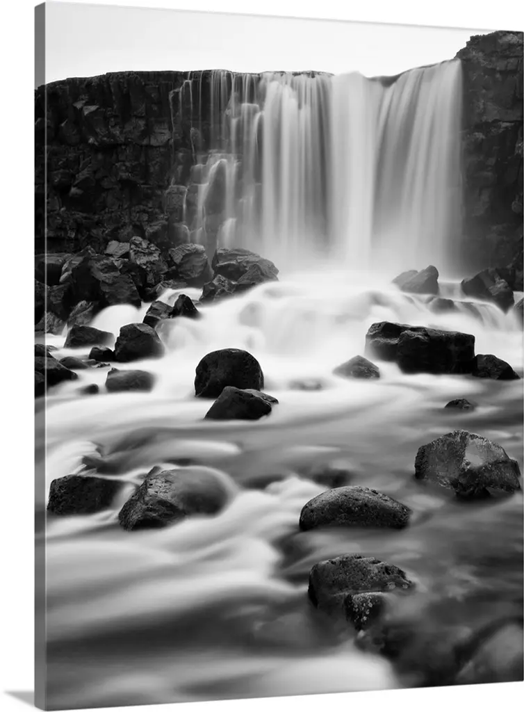 Long exposure image of a waterfall with bright clouds above in Iceland.