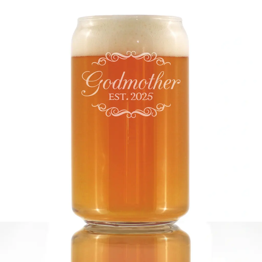 Godmother Est. 2025 - Beer Can Pint Glass - Decorative New Godmother Gifts - 16 Ounce - Clear