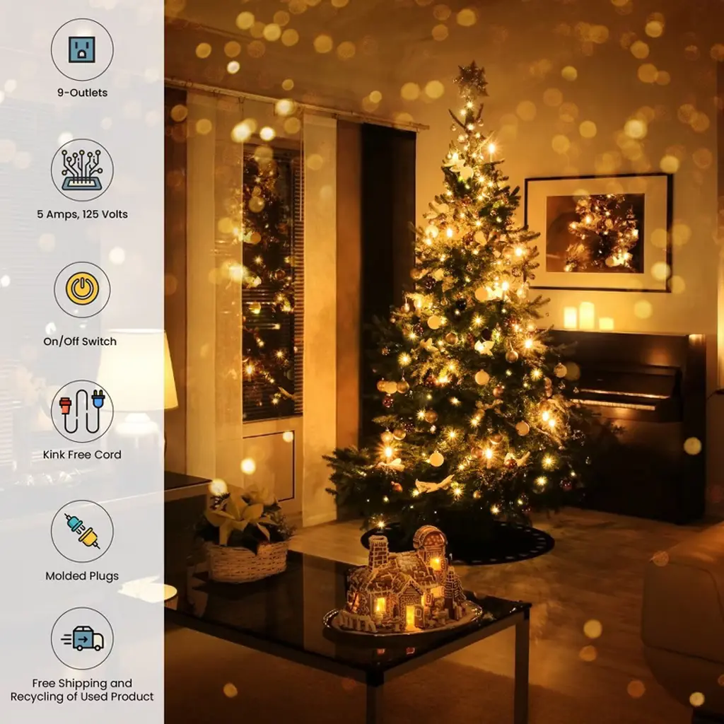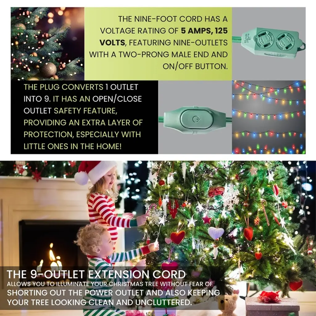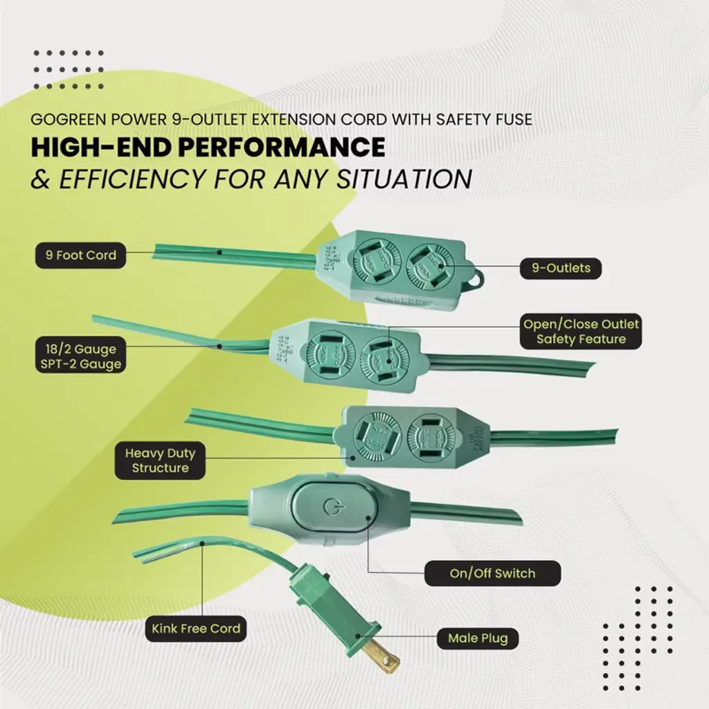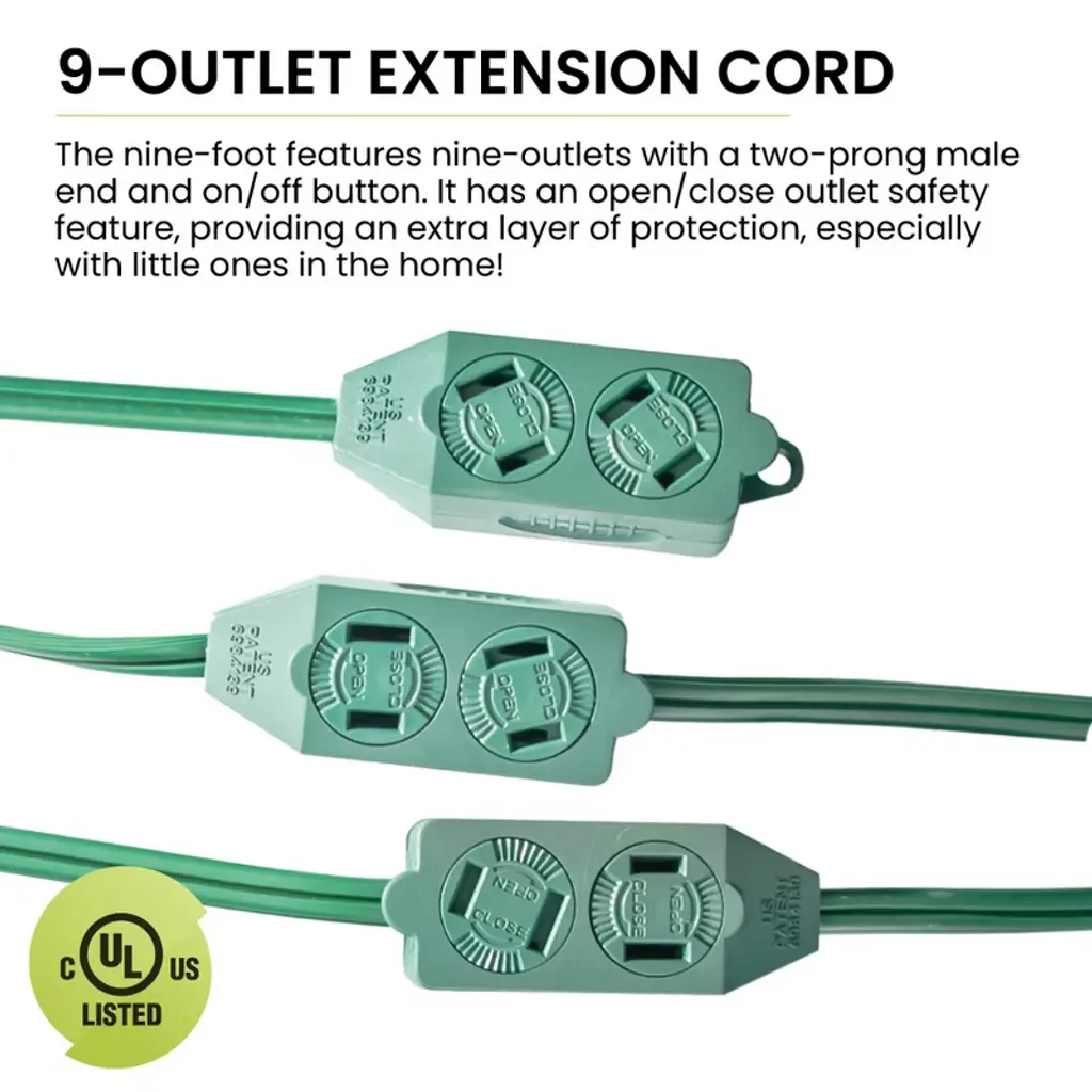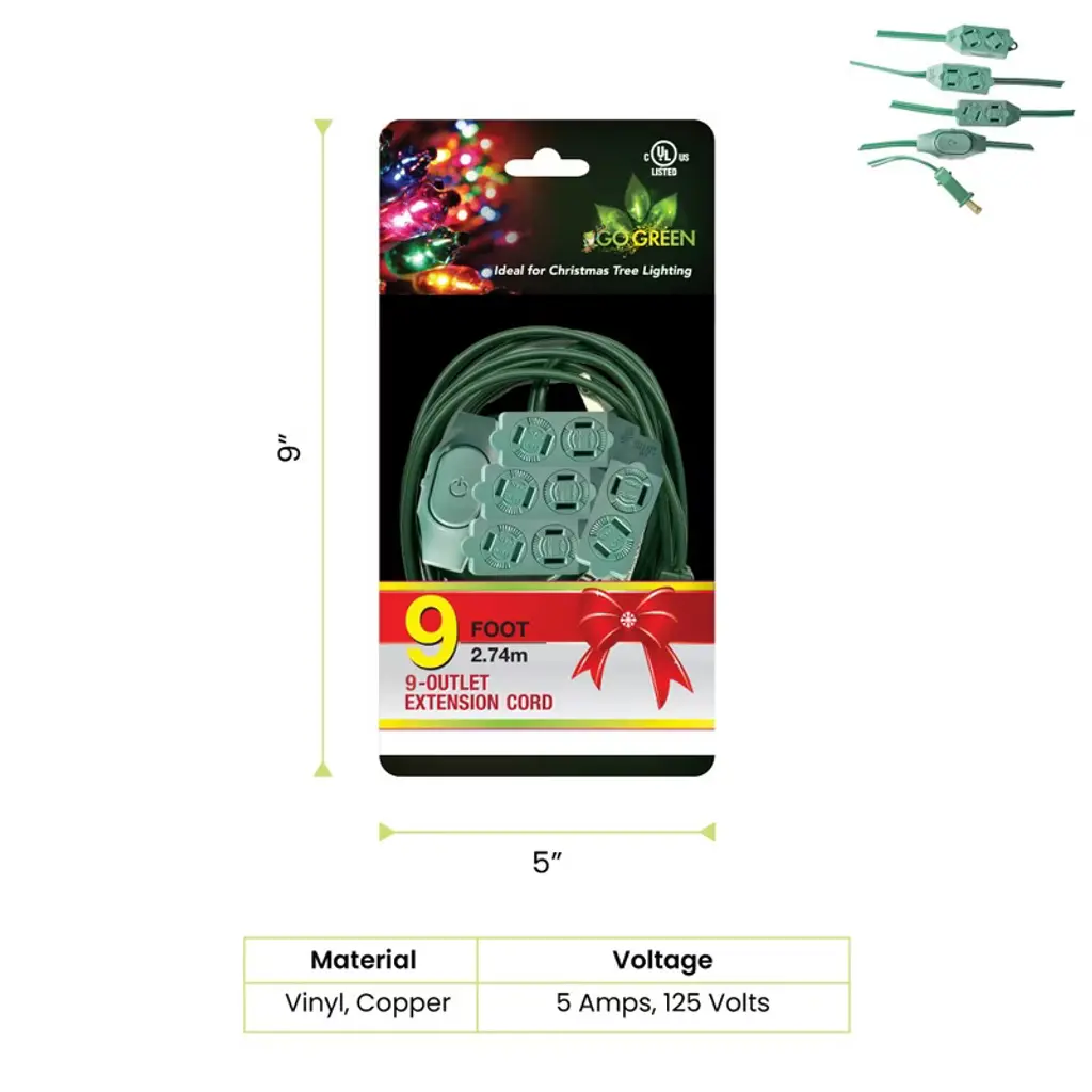 The GoGreen Power (GG-24509GN) is a contractor grade 18/2 SPT-2 extension cord. The plug converts 1 outlet into 9 and is rated for indoor use only. It has an open/close outlet safety feature, providing an extra layer of protection, especially with little ones in the home! The 18 gauge kink-free cord is safe and reliable, providing superb insulation. It can be plugged into a standard 3-prong 120V AC outlet. The heavy duty molded plugs ensure a snug and secure fit and avoid detachment from the wire. The powerful extension cord is 9 feet long. The 9-Outlet Extension Cord allows you to illuminate your Christmas tree without fear of shorting out the power outlet and also keeping your tree looking clean and uncluttered. No Christmas tree is complete without beautiful strings of festive vibrant lights. It's important to be able to plug them all in at once without creating a tangled mess, safely. The indoor extension cord has a voltage rating of 5 amps, 125 volts, featuring nine-outlets with a two-prong male end and on/off button. By purchasing this 9 outlet christmas extension cord, you not only will get a high-quality product; but also get ecological peace of mind with hassle-free recycling. We offer free recycling and free shipping back of the used product to our recycling facility. Please view the recycling code and instructions on the back of the package and visit the GoGreen Power website for additional information.