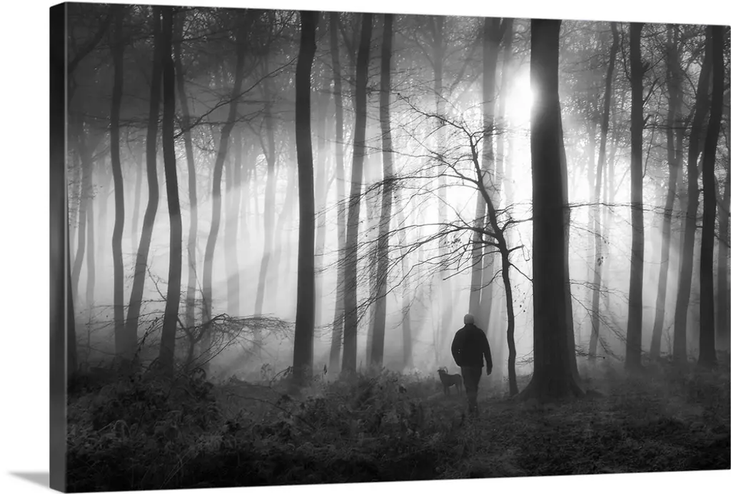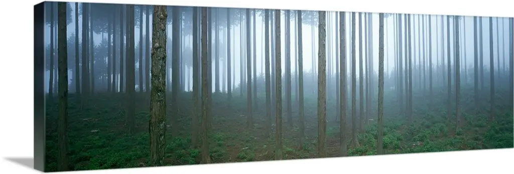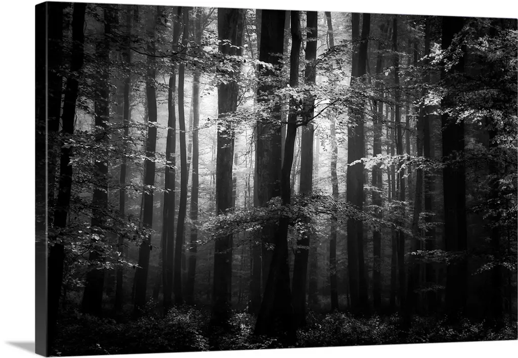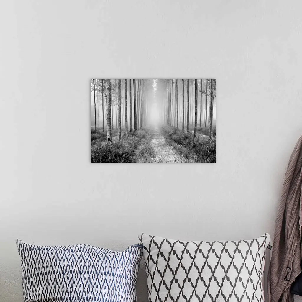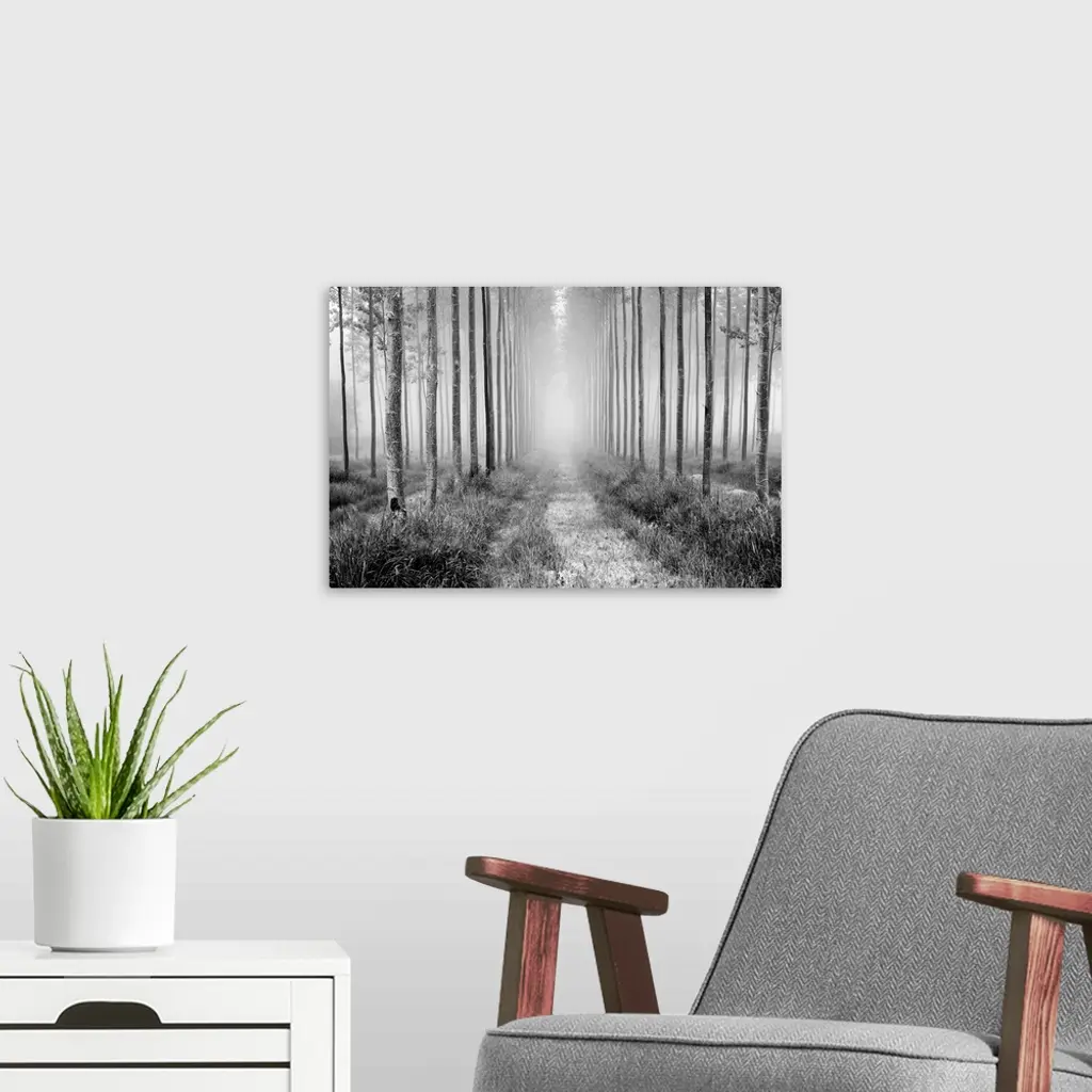 A black and white monochrome symetrical avenue of fine trees balanced in zen harmony with mist.