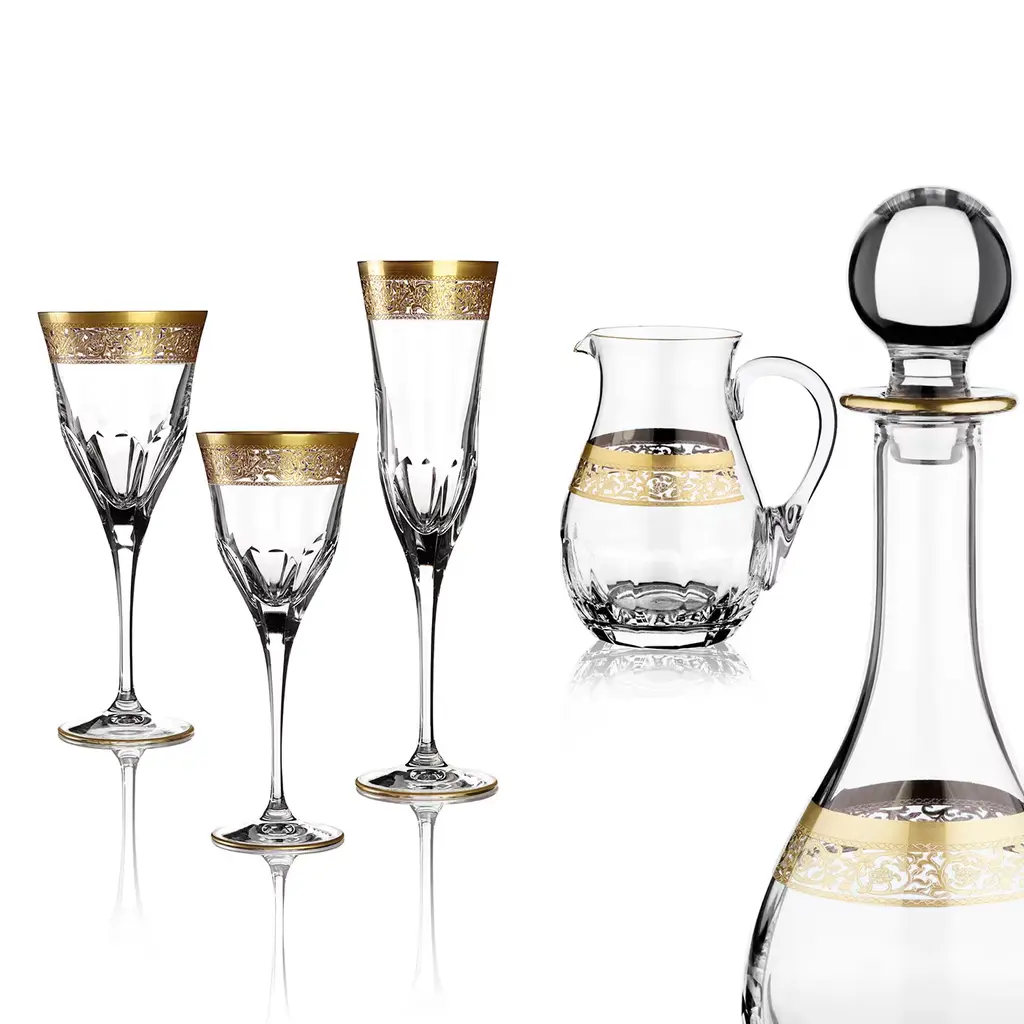 Part of the Gold 421 collection of fine glassware, this set is a refined addition to a sophisticated table, where it will set the tone with its precious gold decoration. The rim of each bowl is adorned with a band and bottom floral motif in gold, whose warm glow will be the focal point of the table.