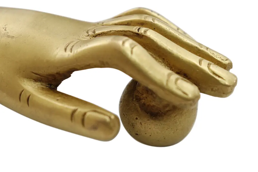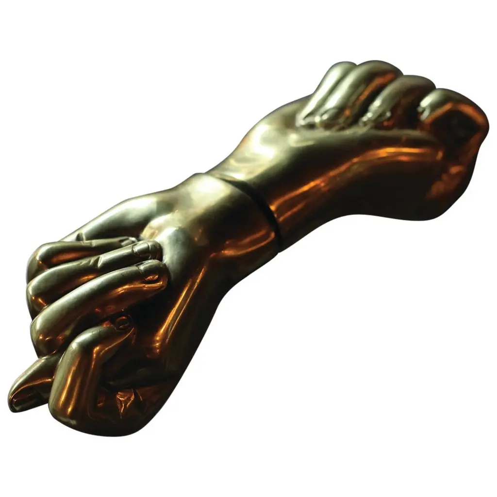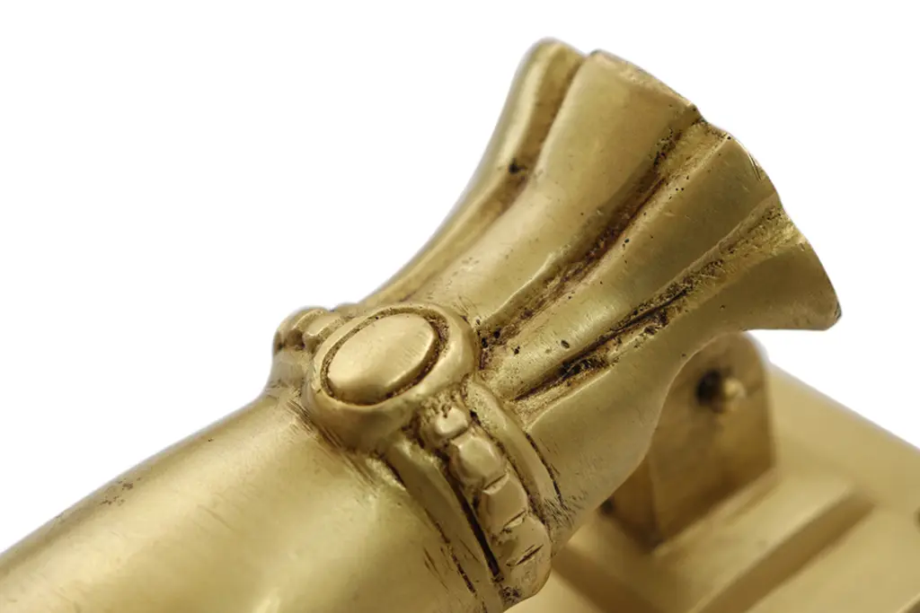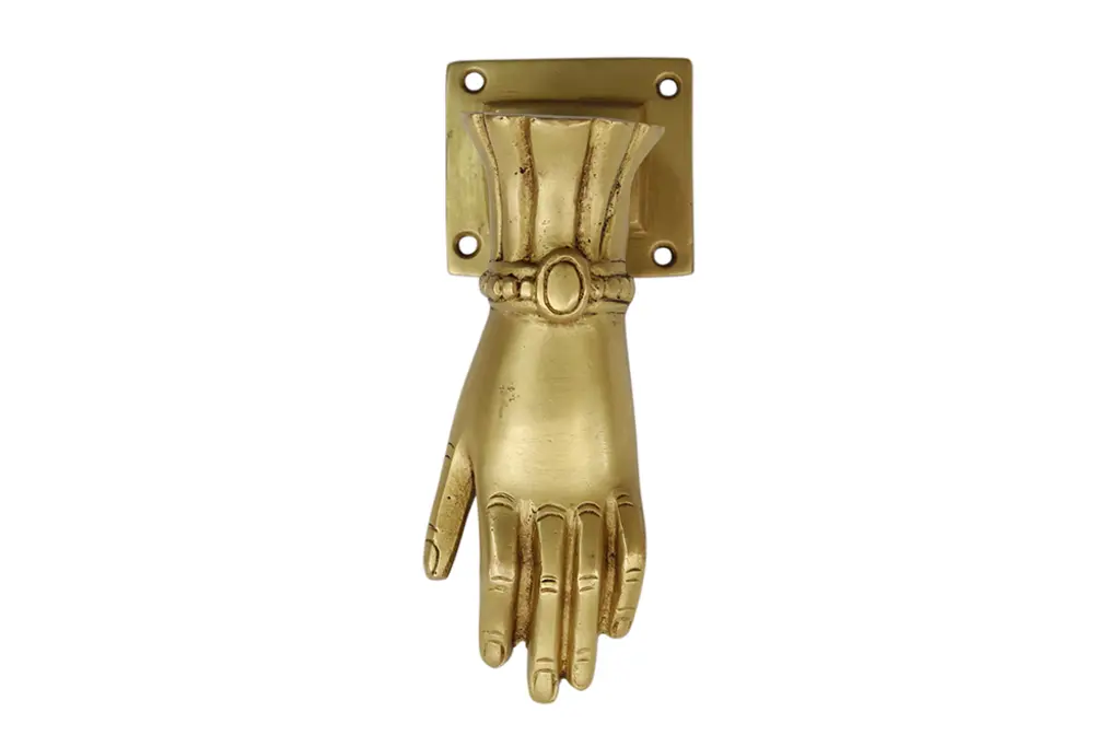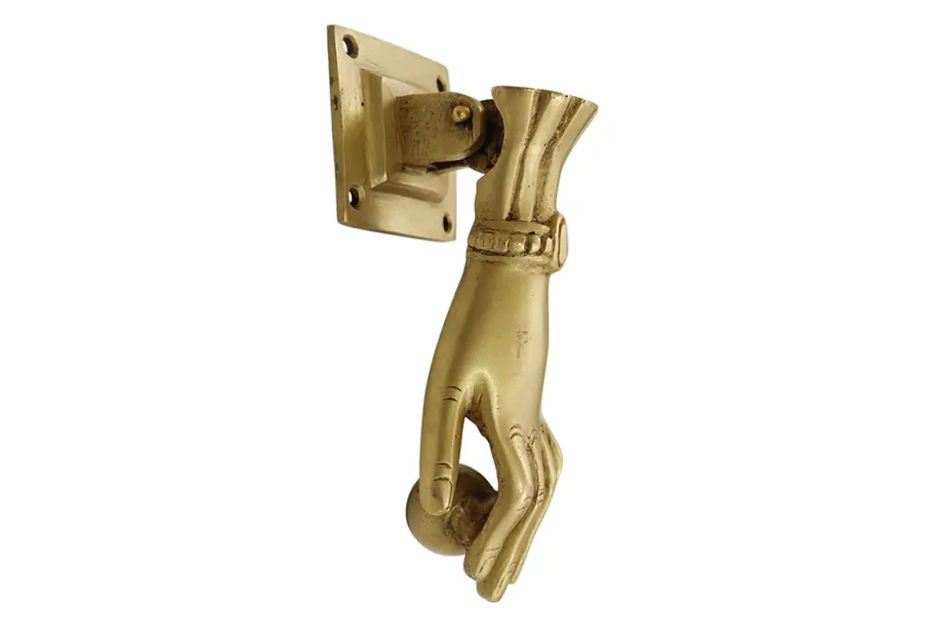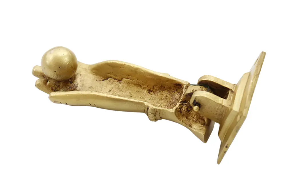 A brass door knocker shaped like a hand holding a ball. Cast with a prominent cuff decorated with a cabochon topped bracelet. Line details define the knuckles and finger tips. A rectangular brass back plate hinges behind the cuff.