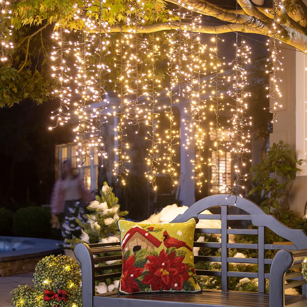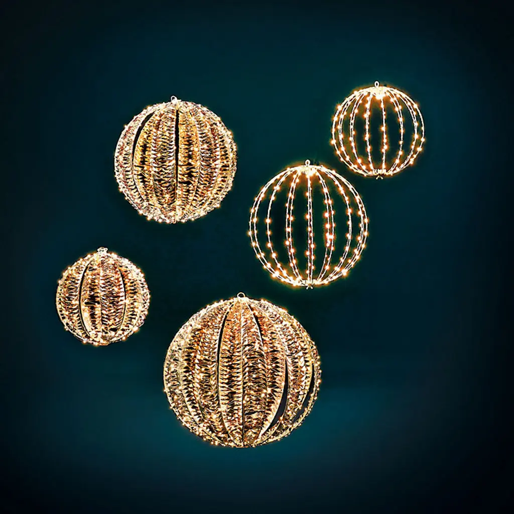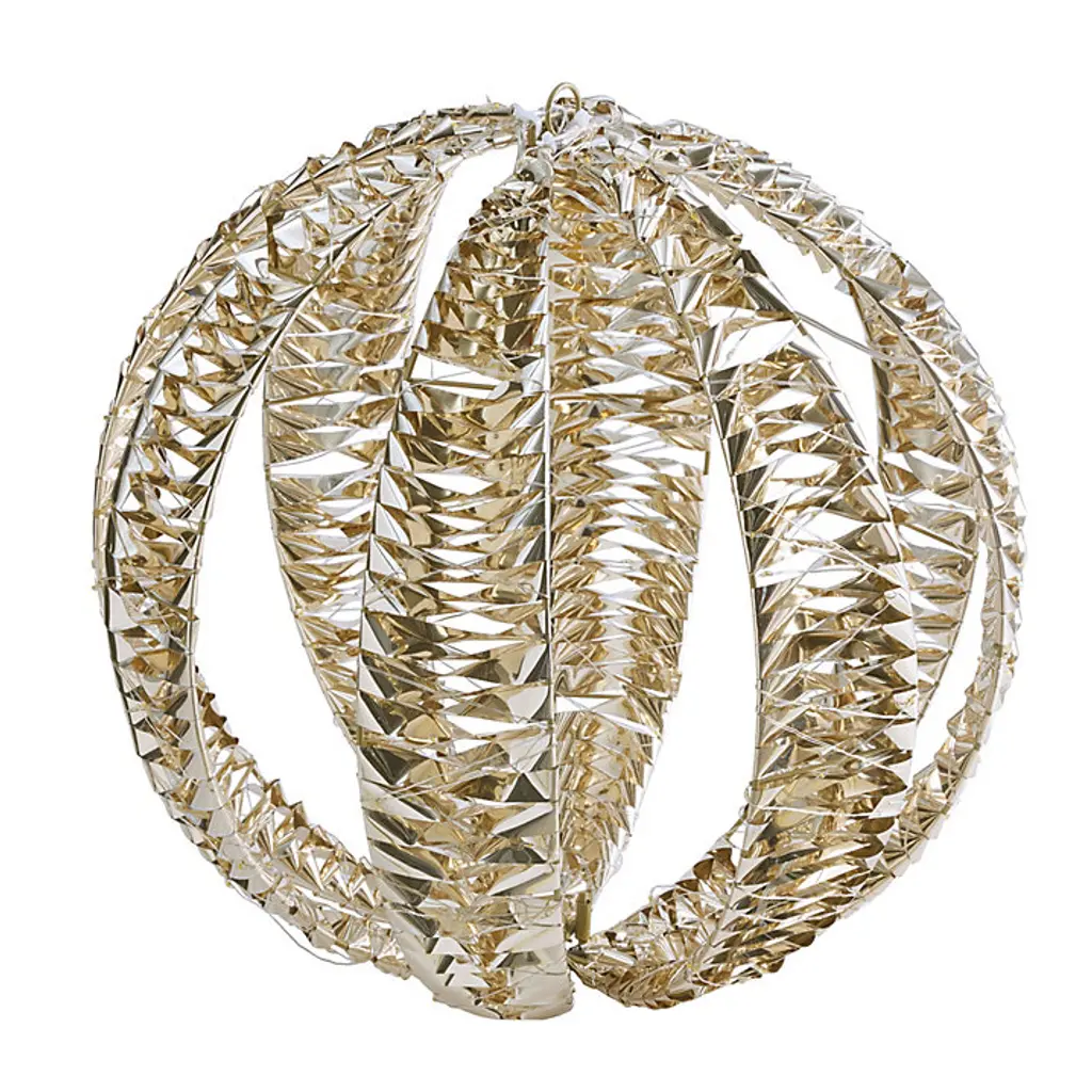 Glamor and sparkle to take your holiday outdoor decor to the next enchanting level. Our Gold Foil Micro LED Twinkle Orb is made of wire and hand wrapped in golden foil for elegant shimmer. Hundreds of warm white, micro LED lights controlled by an 8-hour timer let you orchestrate the light show. Gold Foil Micro LED Twinkle Orb features: