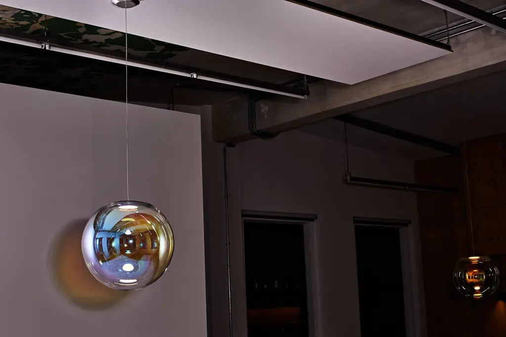 Gold-Indigo Iris globe "30" by Sebastian SchererDimensions: Ø 30 cm.Material: Dichroic-coated mouth-blown glass, polished aluminium. (Also available in brass)Colour: gold-indigo. (Also available in Cyan-magenta, blue-orange, pink-green, and silver-grey).Traditional glass production is done in the oldest glassworks in Germany.The result of ambitious craftsmanship and technological innovation, the Iris pendant light mimics a permanent iridescent soap bubble. An OLED module provides both the light source and mount. A dichroic coating applied using a process developed specifically for Iris creates the impression of movement and ever-changing colours.Awards: Grand Price Lexus Design Award 2014Winner Interior Innovation Award 2015Winner of German Design Award 2016.
