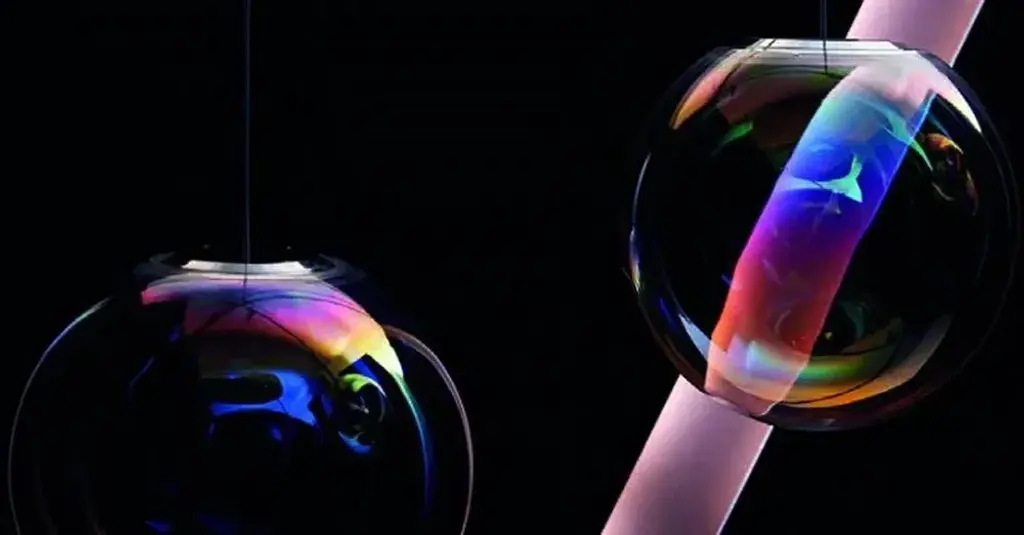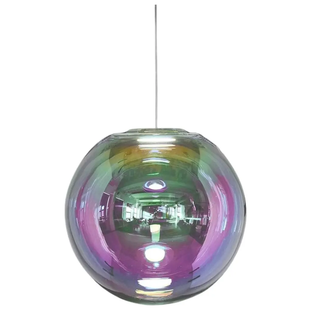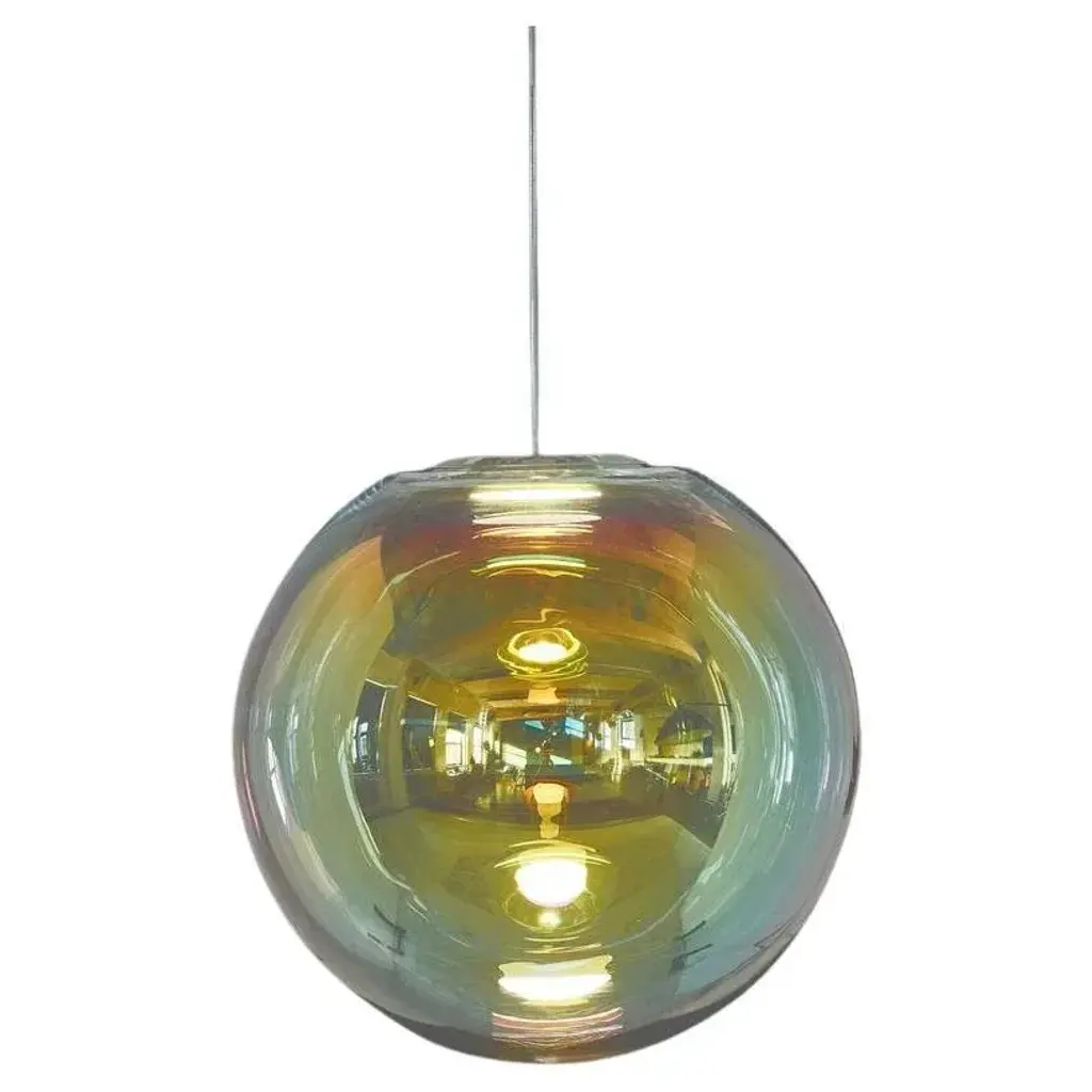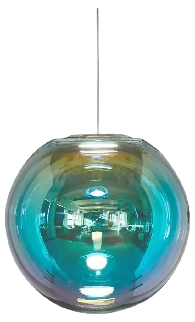 Gold-indigo iris globe "50" by sebastian scherer handmade design: sebastian scherer dimensions: ø 50 cm. Material: dichroic-coated mouth-blown glass, polished aluminium may be available separately in brass colour: gold-indigo may be available separately in blue-orange, pink-green, cyan-magenta, silver-grey traditional glass production in the oldest glassworks of germany the result of ambitious craftsmanship and technological innovation, the iris pendant light mimics a permanent iridescent soap bubble. An oled module provides both the light source and mount. A dichroic coating, applied using a process developed specifically for iris, creates the impression of movement and ever-changing colours. Awards: grand price lexus design award 2014 winner interior innovation award 2015 winner german design award 2016. This piece is attributed to the mentioned designer/maker. It has no attribution mark and no official proof of authenticity, however it is well documented in design history. I take full responsibility for any authenticity issues arising from misattribution