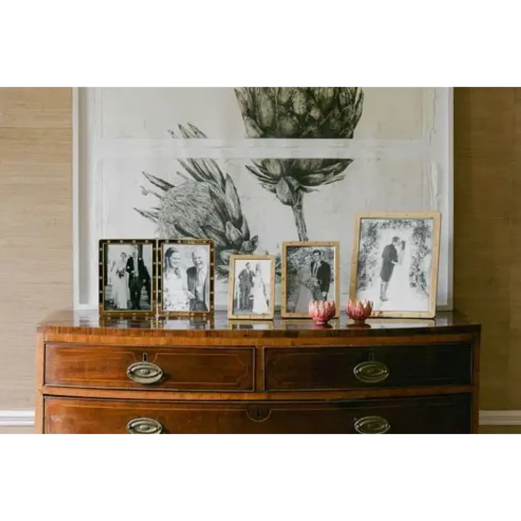 A beautiful gold plated frame with screw detail, curved corners and a beautiful dove grey velvet backstand. Able to stand landscape or portrait and beautifully gift boxed.