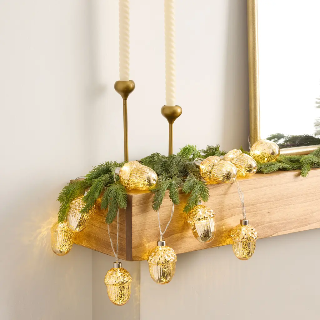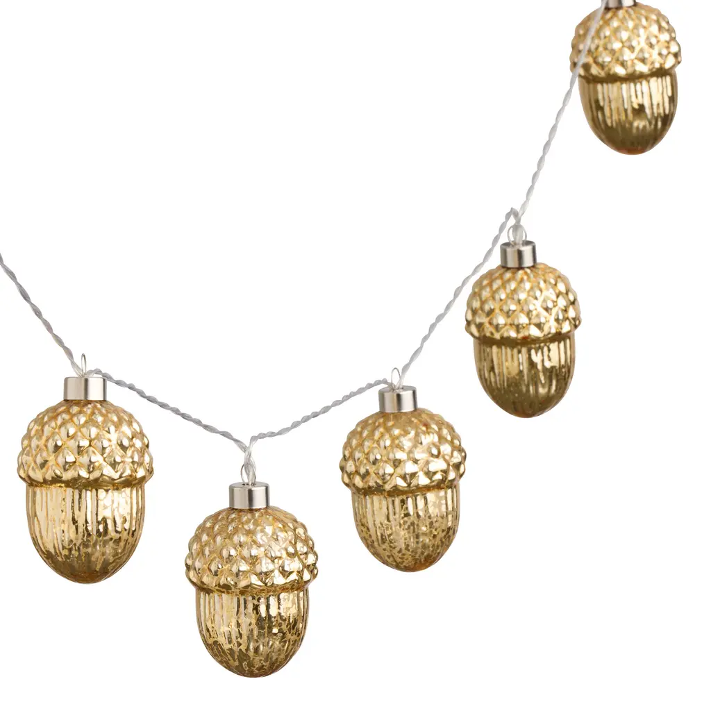 Create a dreamy woodland scene in your harvest home with our strand of 10 acorn-shaped LED string lights. Made of mercury glass in a gold finish that radiates with a warm and welcoming glow, this dimensional decor is an irresistible addition to the holiday season. Battery operated and strung on flexible wire, you can style this autumnal find any way you like - to dress up windows, mantels, tabletop displays, and more.