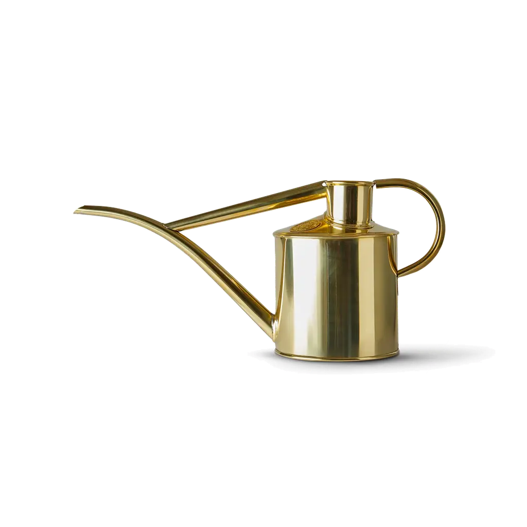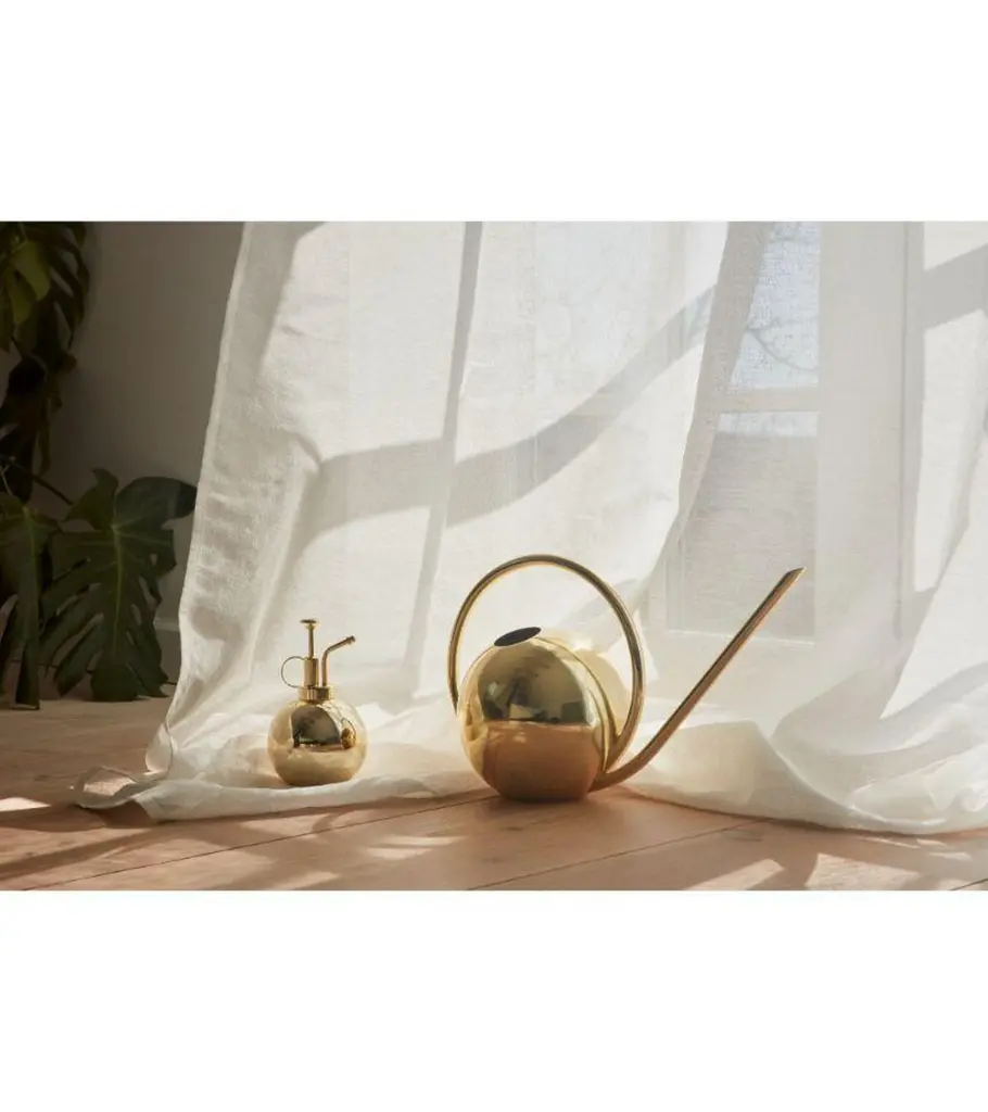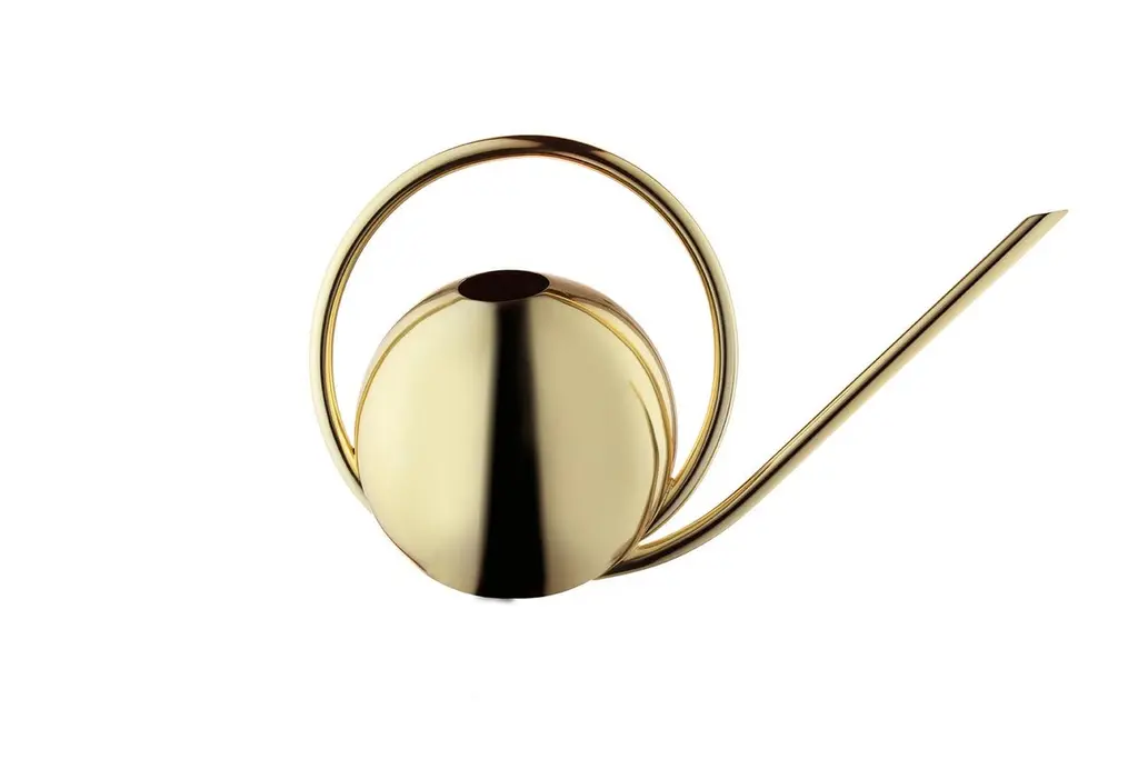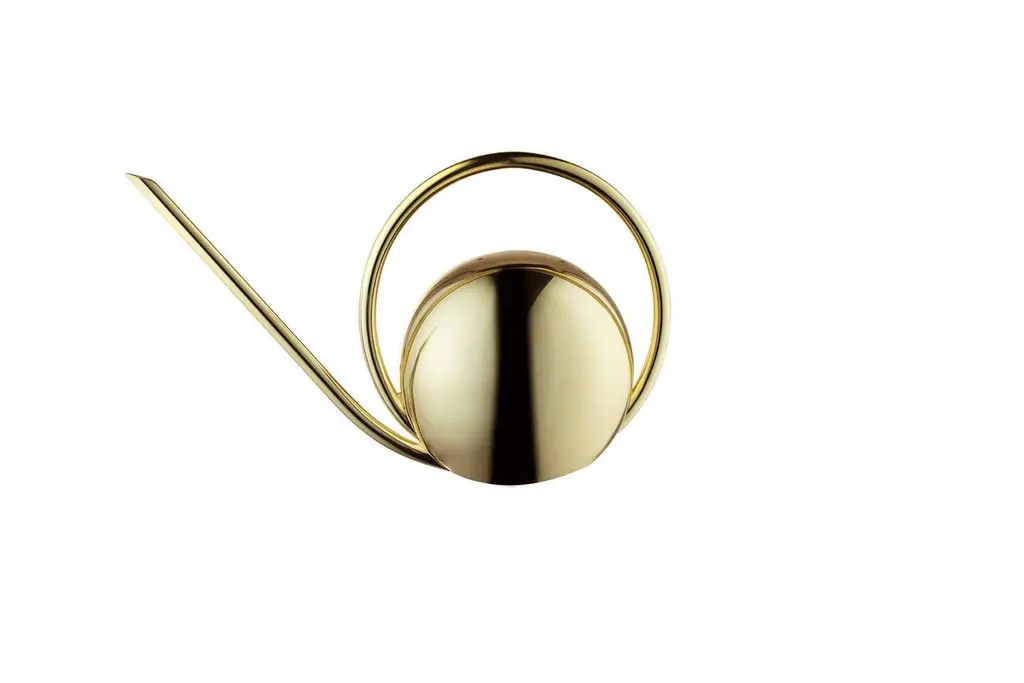 Gold Minimalist watering canDimensions: D 37.2 x W 17 x H 23.1 cm Materials: Steel. Also available in black. The opening of the globe watering can is elegantly off-centered, making it accessible and unique all at once. A piece that is meant to be displayed and that is suitable for both indoor and outdoor usage.