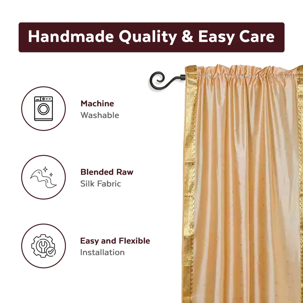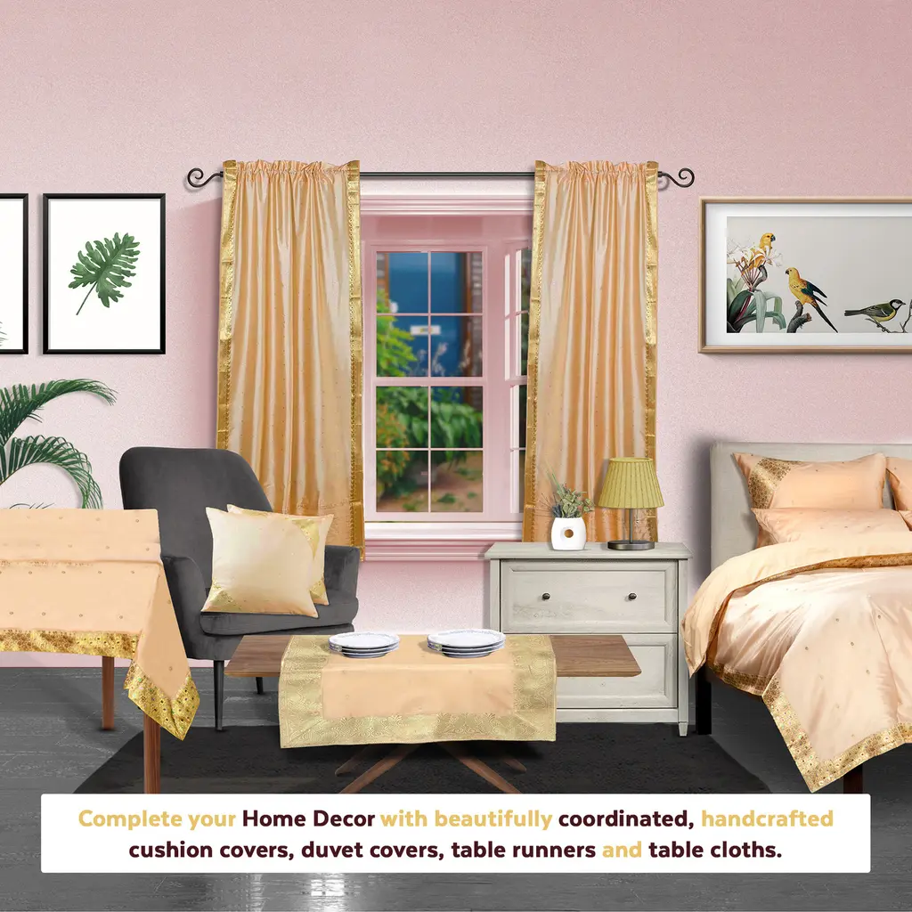 Add splendor to any room in your home with these rod pocket sari sheer curtains from India. These handmade drapes are heavily bordered with excellent artwork Sari Curtains / Drapes / Panels are the perfect choice for those looking for light, elegant drapes with a touch of luxury. It has smooth finish with a soft sheen and feels gentle and cool to the touch. Sheer curtains made of saris allow light in through windows but prevent people looking in when they are drawn. Story Behind the Art: The fabric of these curtains are weaved on a hand-loom in a small rural village in India and then hand-dyed. The artisans are a group of young hand-crafters who have moved from small villages to a big town in Central India and make various home decor items out of these exotic sari fabrics. This gives these wonderful artisans a way to have sustainable income via selling to the worldwide market on the internet. Your purchase supports local and home-based work where the artisans can easily tend to their families and pass these time-honored skills from one generation to the next.