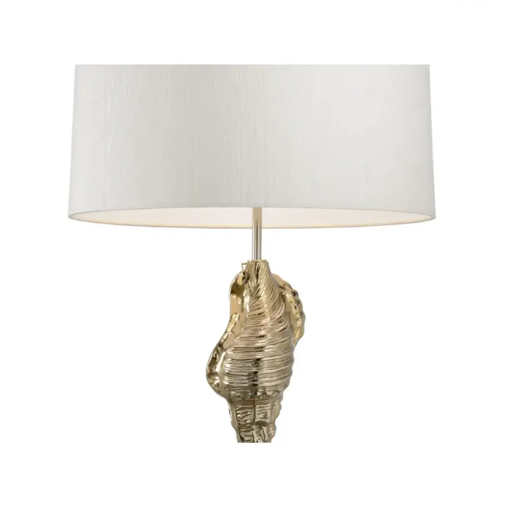 INSPIRED BY THE EXQUISITE CONCH SHELLS ALONG THE COAST OF THE OUTER BANKS, GOLD SHELL WISHES LAMP CREATES A SOPHISTICATED BEACH VIBE IN YOUR SPACE. LIGHT REFLECTING OFF OF THE WARM POLISHED BRASS FINISH ELEGANTLY HIGHLIGHTS THE BEAUTIFUL TEXTURAL DETAILS OF THE SHELL. A CREAM, RAW SILK SHADE COMPLEMENTS THE CHIC DESIGN PERFECT AN ENTRYWAY, BEDROOM OR LIVING AREA IN YOUR COASTAL HOME.