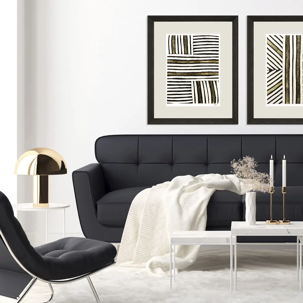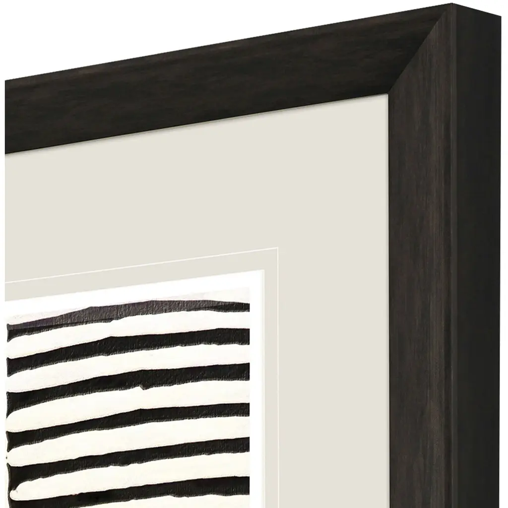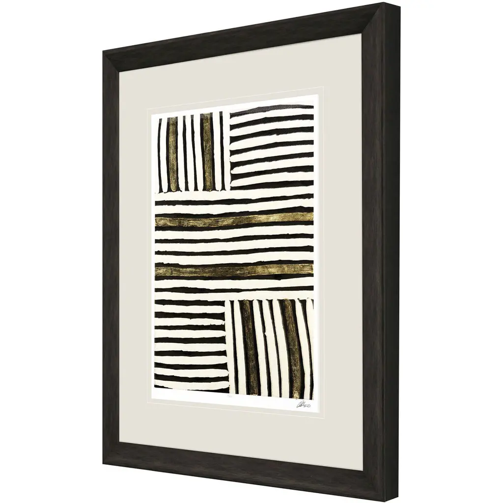 Geometric giclee on fine art paper is hand embellished and double matted in oyster. Framed in an angled profile moulding in a dark wood finish.