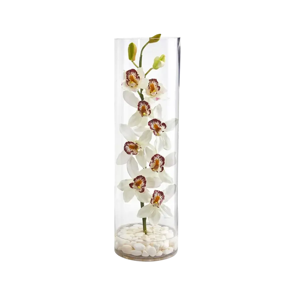 The Golden Column Orchid is a breathtaking, lifelike arrangement featuring a tall, elegant stem adorned with delicate white blooms accented by rich, golden-brown centers. Crafted with meticulous detail, the petals mimic the natural texture and grace of a real orchid, complimented by green buds. Displayed in a clear cylindrical vase filled with decorative white pebbles, this lifelike plant adds a touch of refined beauty to any setting with zero maintenance required.