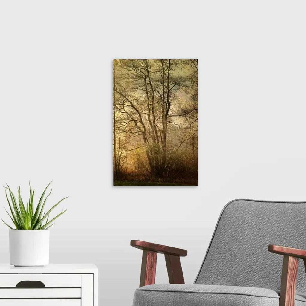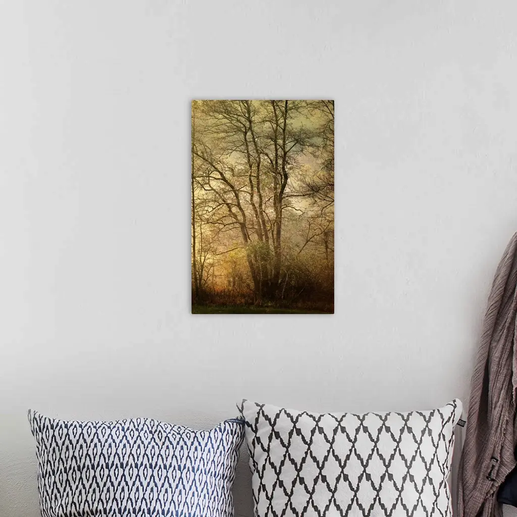 Fine art photo of a dense forest in the late afternoon with golden light from the setting sun.