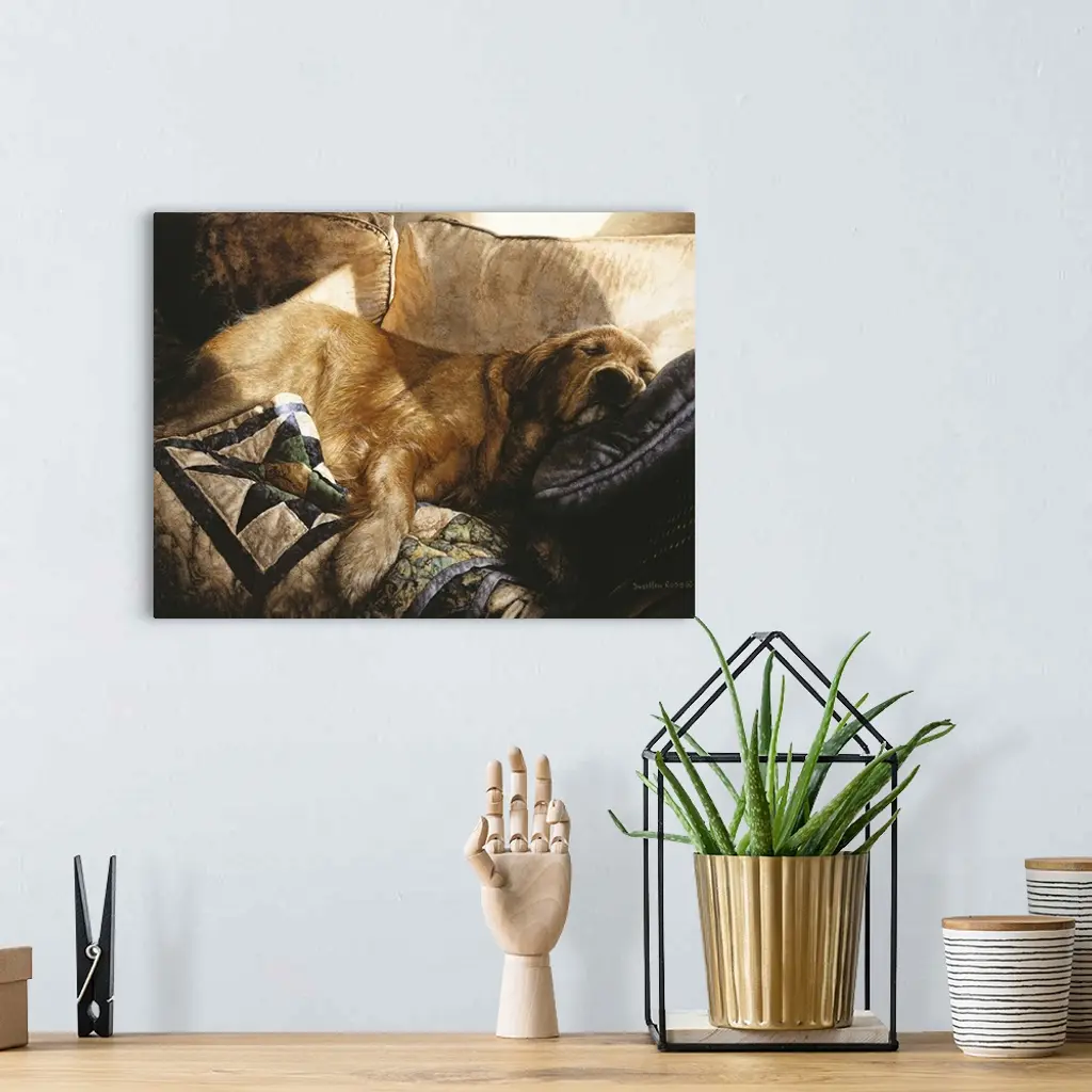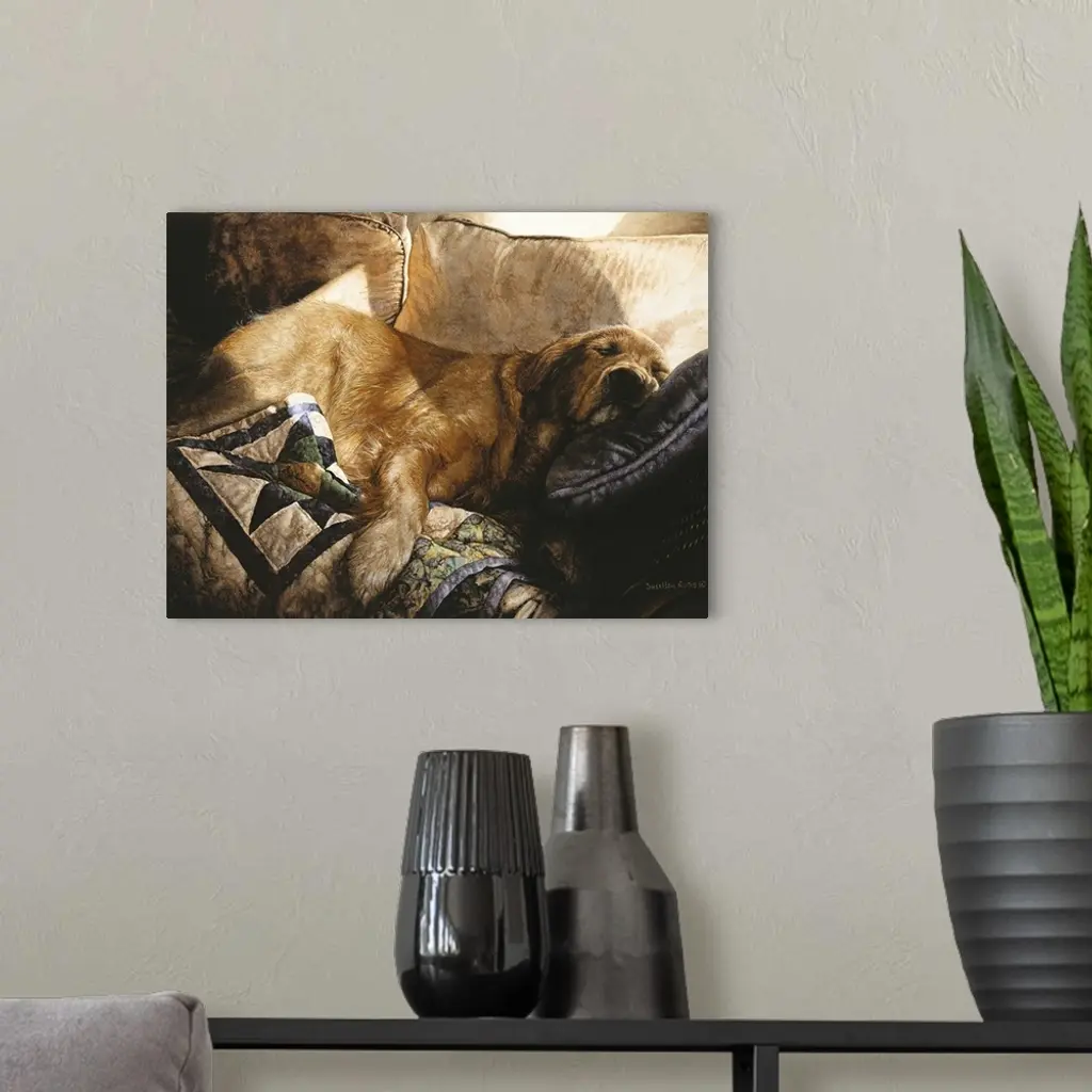 A golden Labrador sleeping on a couch with streaks of sunlight coming in the room.