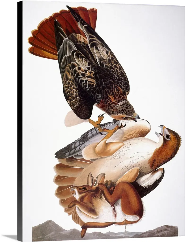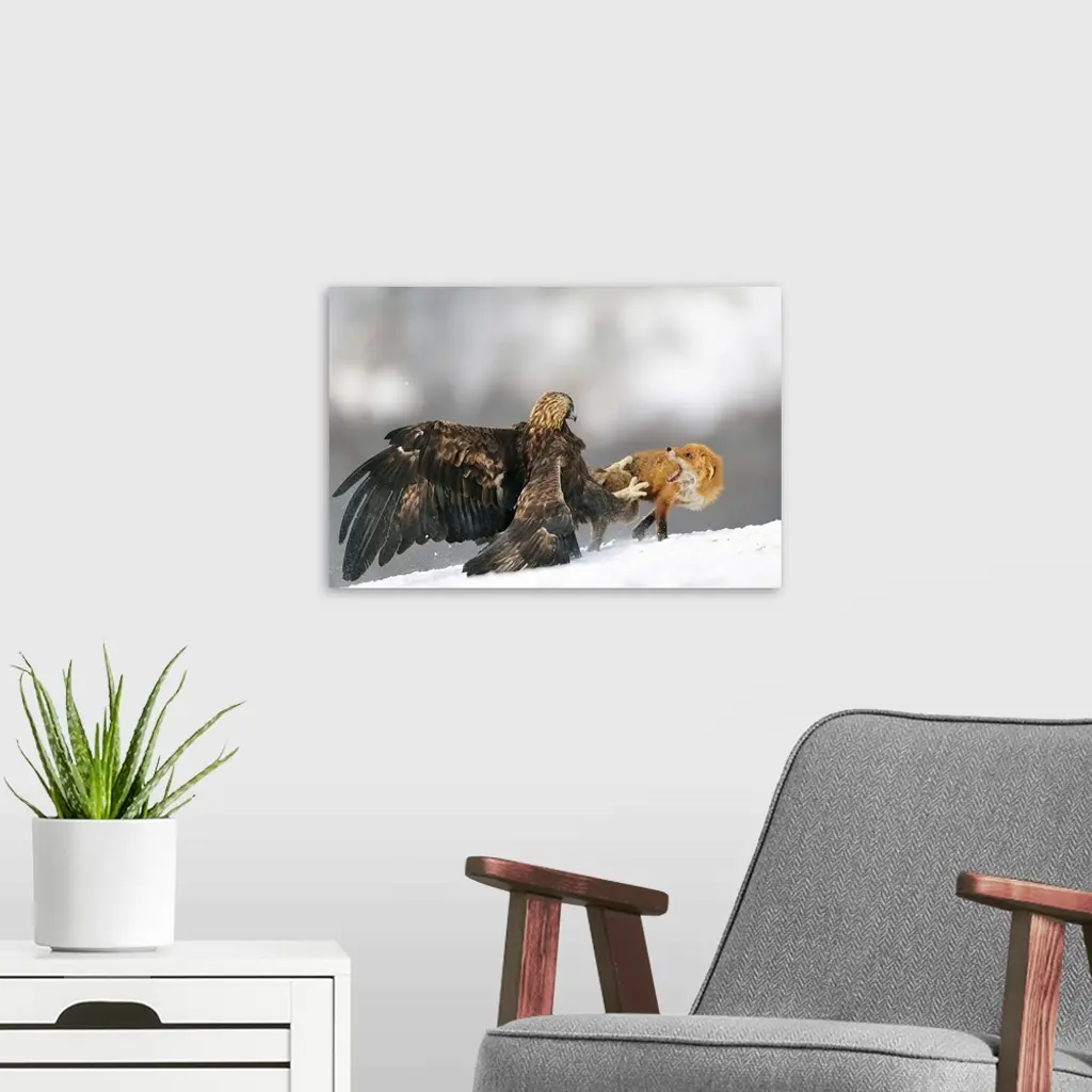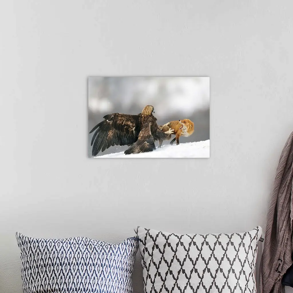 A large Golden Eagle attempts to grab a red fox in its talons.