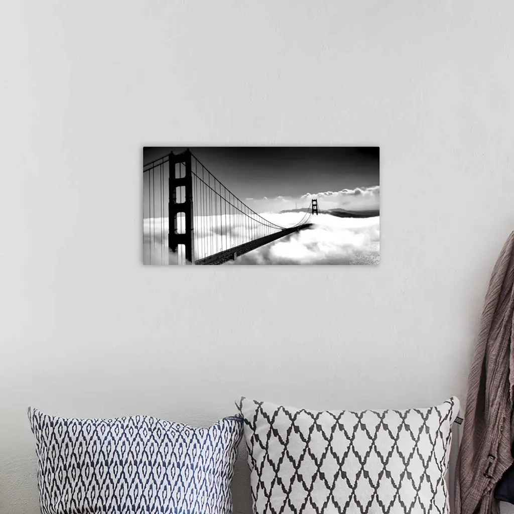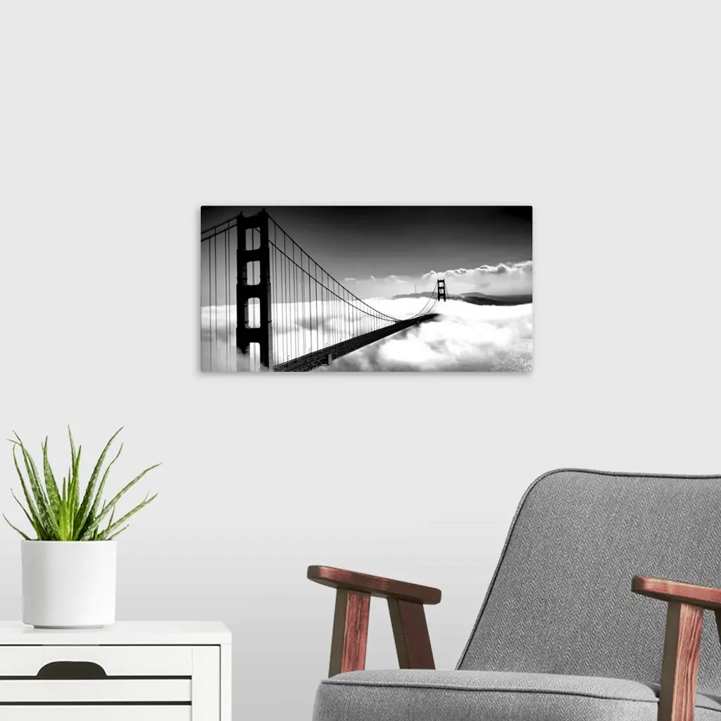 Black and white image of the Golden Gate Bridge in San Francisco rising above the clouds.