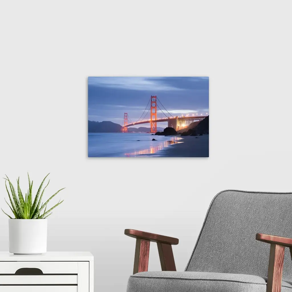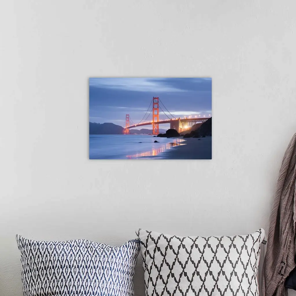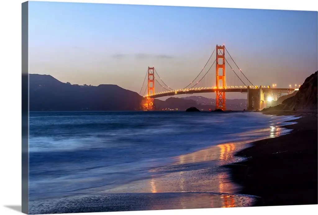 A soft and dreamy photograph of the golden gate bridge in San Francisco lit up in the early evening.