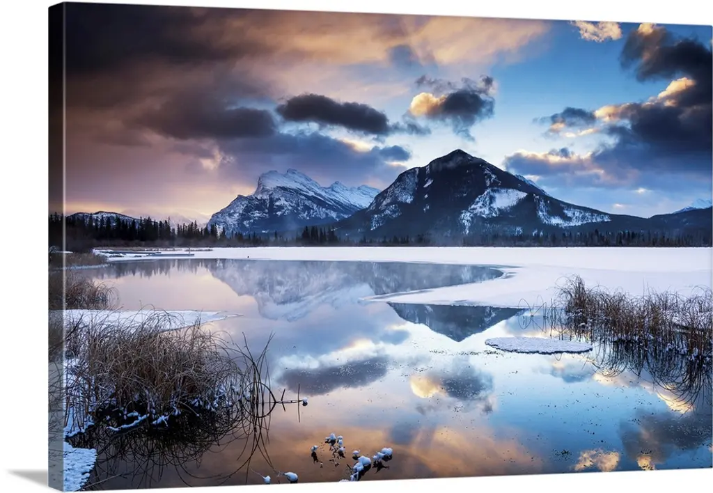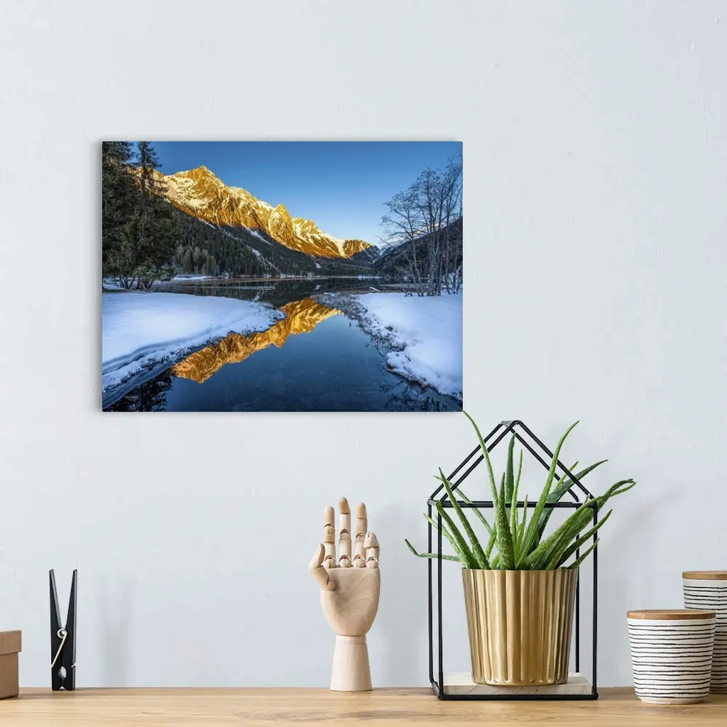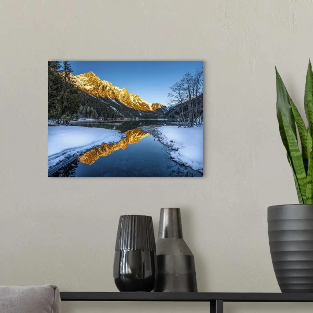 An alpine landscape in the middle of Lake Anterselva after a heavy snowfall. The sunset with its warm colors color the peaks of the mountains that are reflected in the lake. It is a very relaxing image.