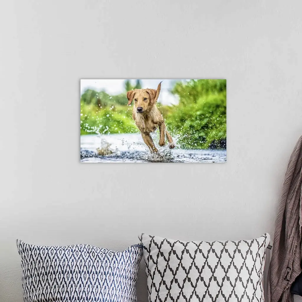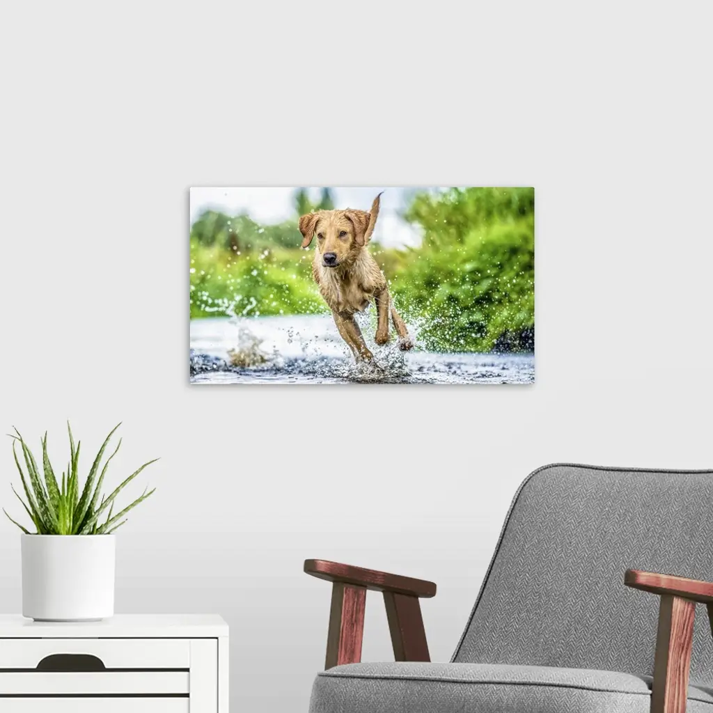 Golden Labrador Running Through A Shallow River, United Kingdom, Europe